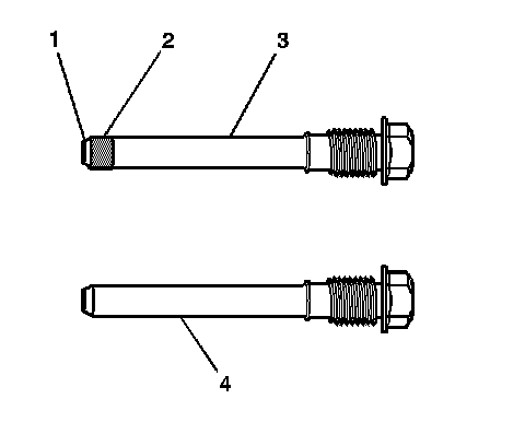 2. Apply lubricant, GM P/N 18047666, or equivalent, to the brake caliper pin bolts. Apply a thin layer to the pin bushing (2) and to the caliper pin bolt shank (3, 4). Ensure that there is not a buildup of excess lubricant at the end of the leading caliper pin (1), in front of the bushing.