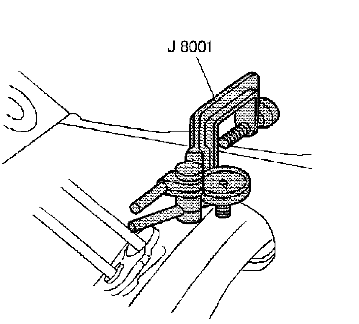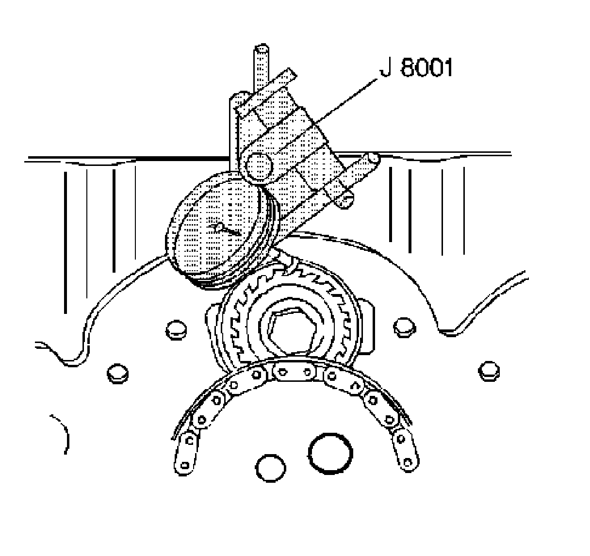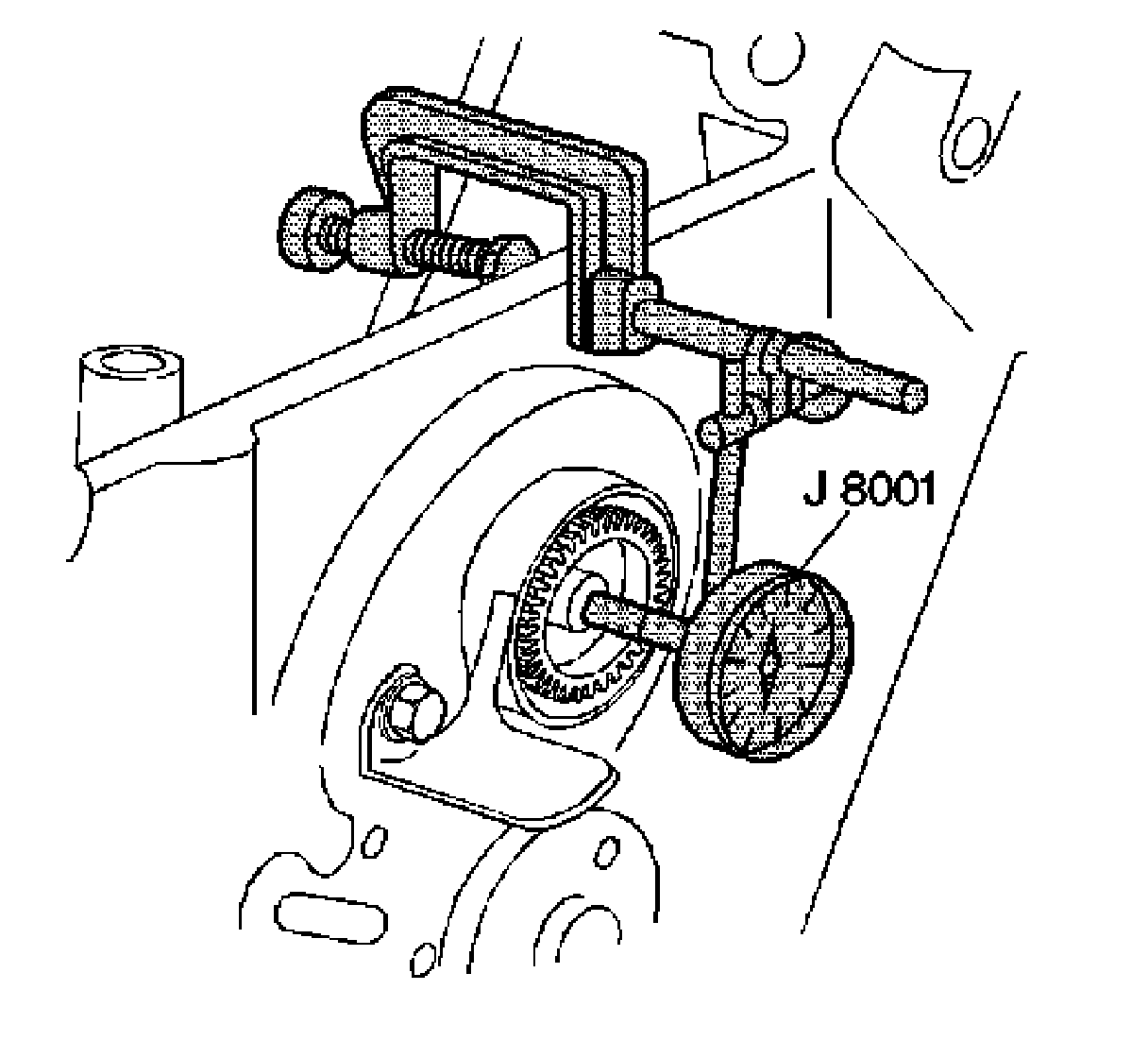 6. Using J 8001 measure the balance shaft end play. End play must not exceed 0.028 mm (0.008 inch).