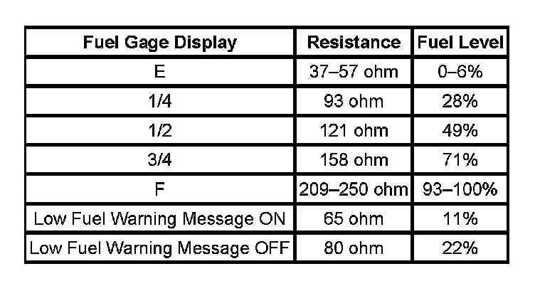 The information in this table is intended for use with the J 33431-C Signal Generator and Instrument Panel Tester. The fuel level sensor values represent the test values to be used on the Signal Generator to drive the fuel gage display to the indicated positions. Vehicles that require more than one fuel level sensor calculate gage position from many possible resistance combinations of fuel levels between the two tanks. Therefore, the values in the table may not correlate directly to readings taken from the vehicle primary or secondary sending units.
