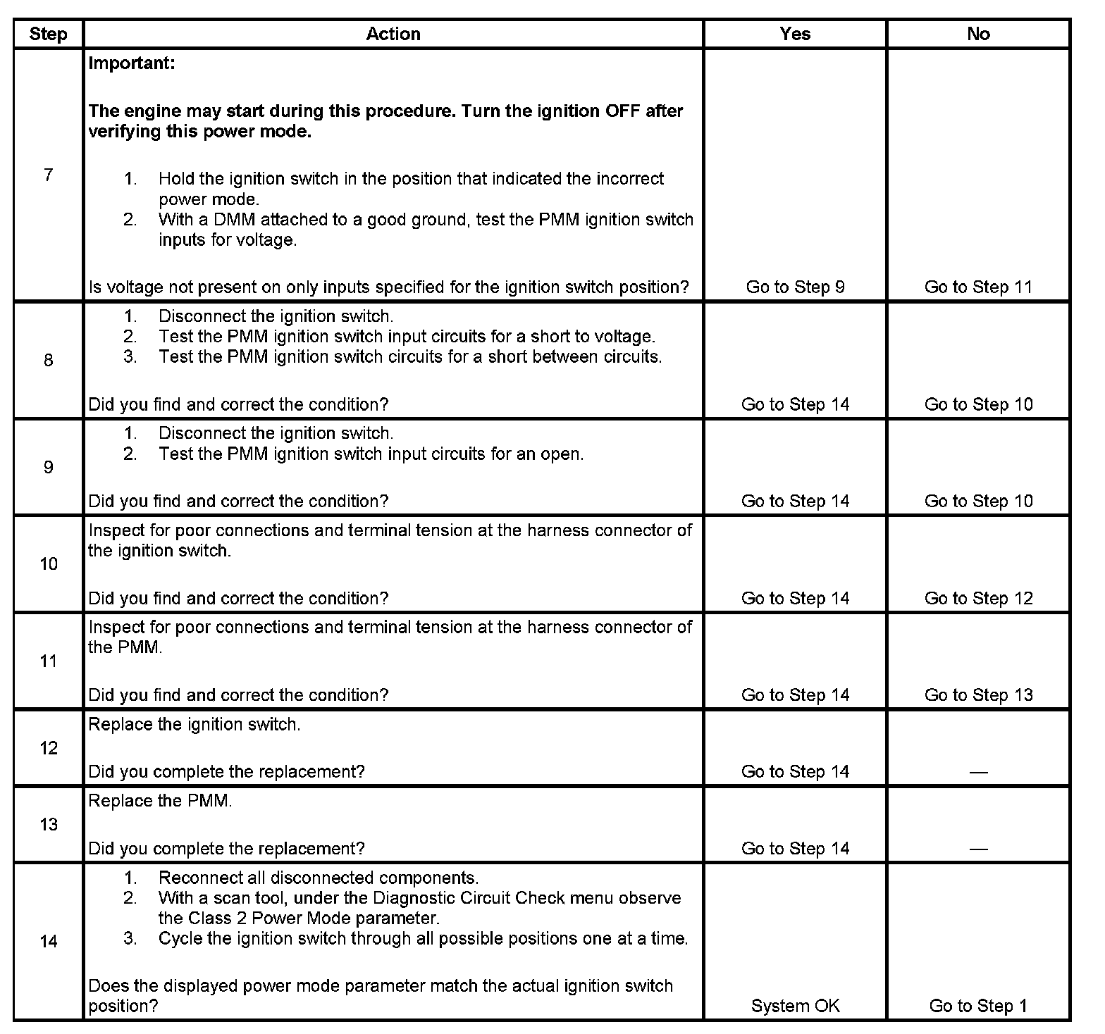 The numbers below refer to the step numbers on the diagnostic table.