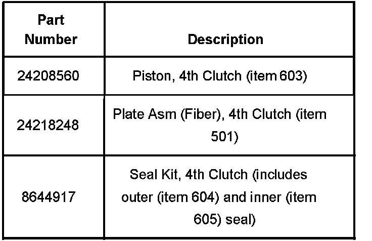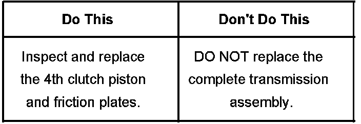 Inspect the 4th clutch piston, the seals and fiber plates. The plates may show signs of excessive heat in the center of the plate. The fiber plates may also show signs of heat in the adjacent area. Normal plates are heat treated and have a slightly dark appearance.