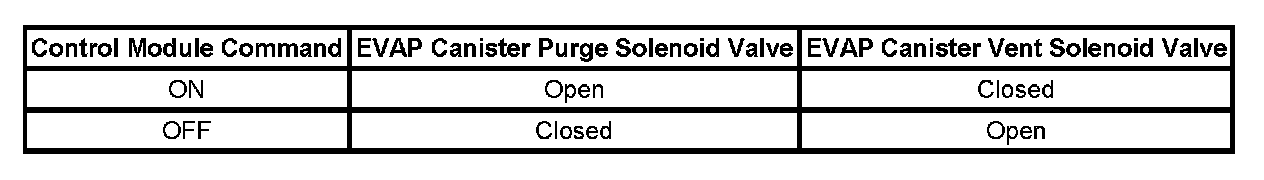 The table illustrates the relationship between the ON and OFF states, and the Open or Closed states of the EVAP canister purge and vent solenoid valves.