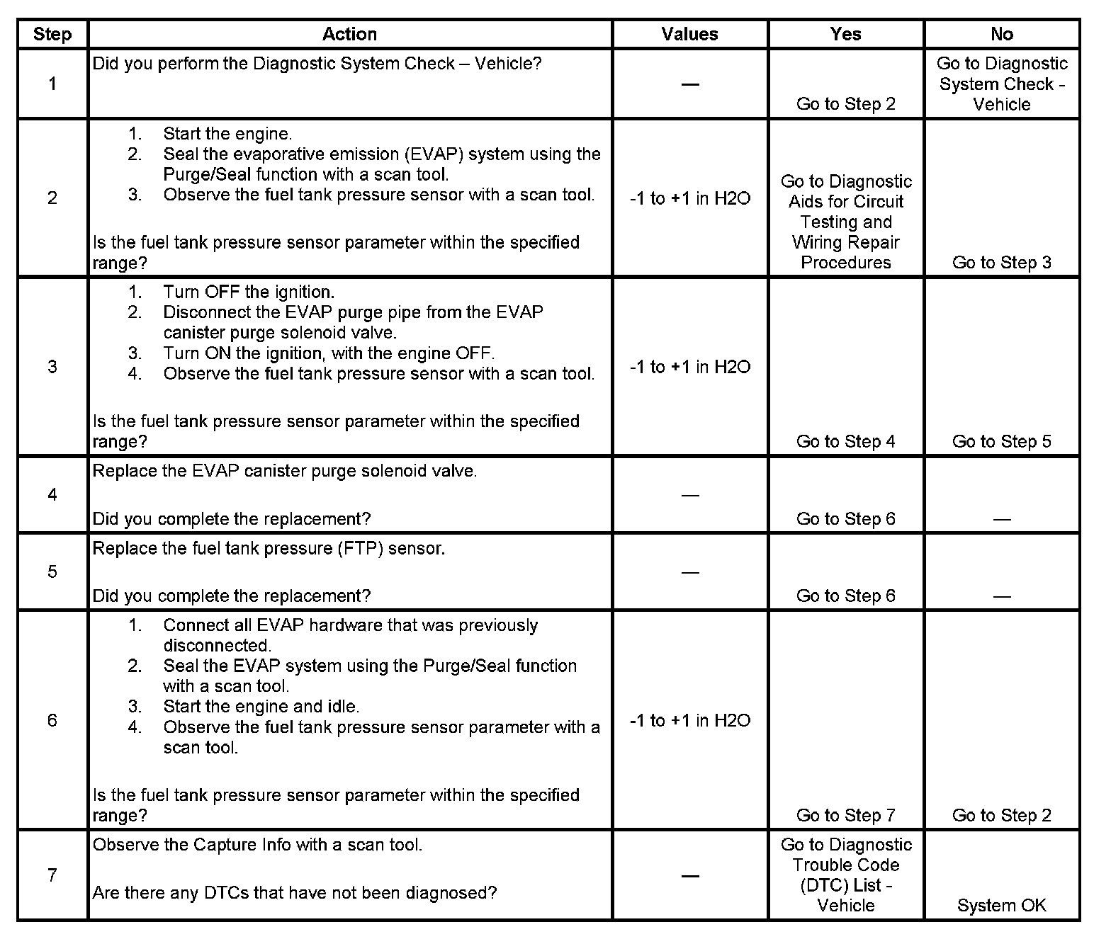 This DTC tests for undesired intake manifold vacuum flow to the evaporative emission (EVAP) system. The control module seals the EVAP system by commanding the EVAP canister purge solenoid valve OFF and the EVAP canister vent solenoid valve ON. The control module monitors the fuel tank pressure (FTP) sensor to determine if a vacuum is being drawn on the EVAP system. If vacuum in the EVAP system is more than a predetermined value within a predetermined time, this DTC sets.