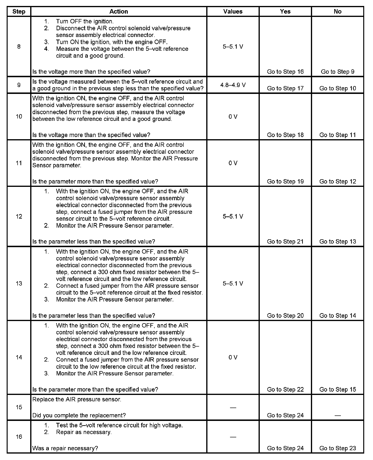 15. The low reference, the AIR pressure signal, the 5-volt reference circuits and the PCM have tested OK. Replace the AIR control solenoid valve/pressure sensor assembly.