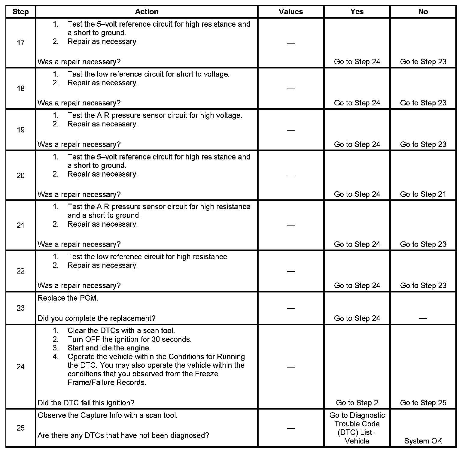 The numbers below refer to the step numbers on the diagnostic table.