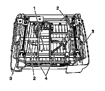 1. The horizontal drive motor (1) and the drive cables (4) are located at the front of the seat. Verify that both cables are straight. If a cable is bent, an end will be pulled out of the drive motor or the drive screw. Straighten the cable. The seat switch may have to be toggled back and forth to get the cable ends to seat properly.