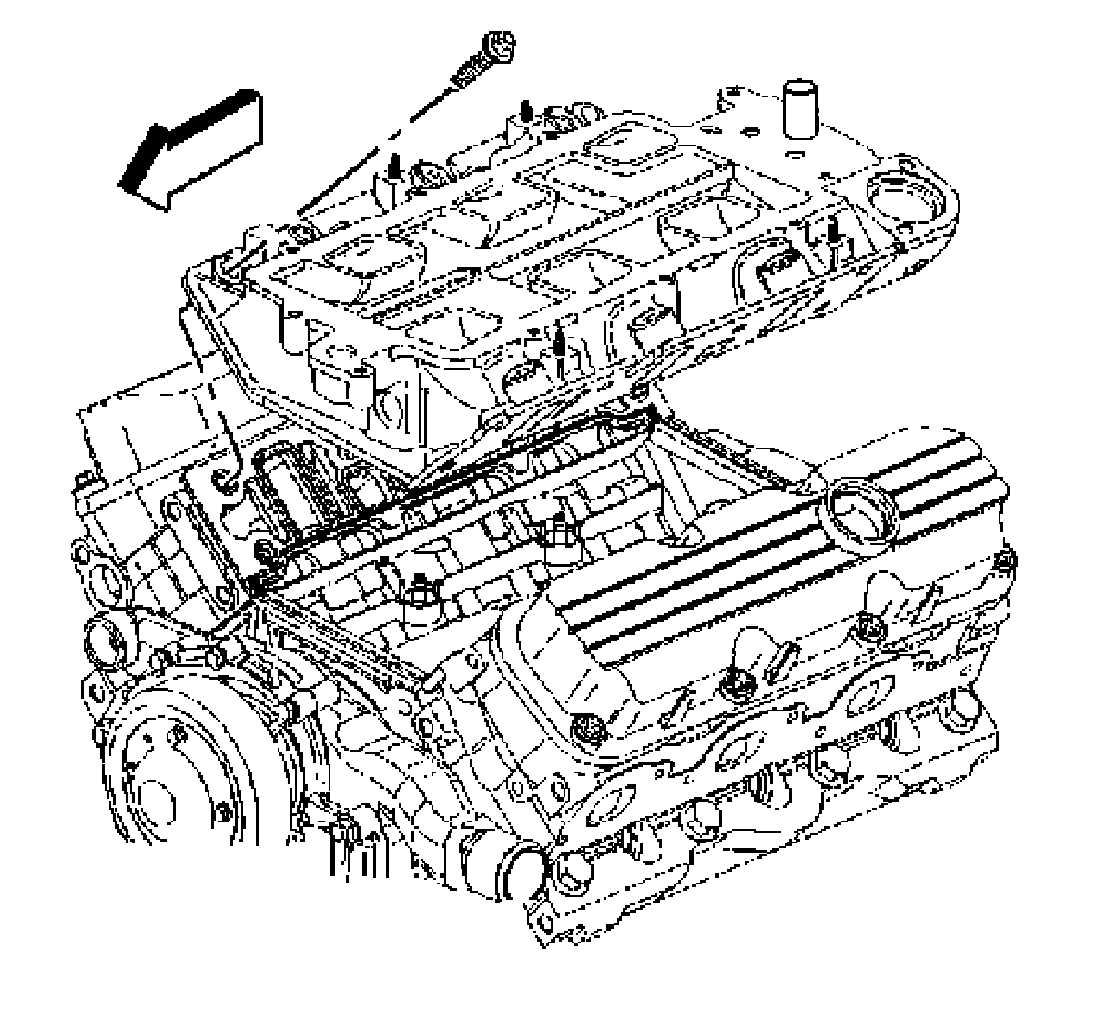 Important: Bolts which fasten the lower intake manifold to the cylinder head are accessible only after the upper intake is removed. The bolts are located in the right front and left rear corners of the lower intake manifold.Remove the upper intake manifold to service the lower intake.