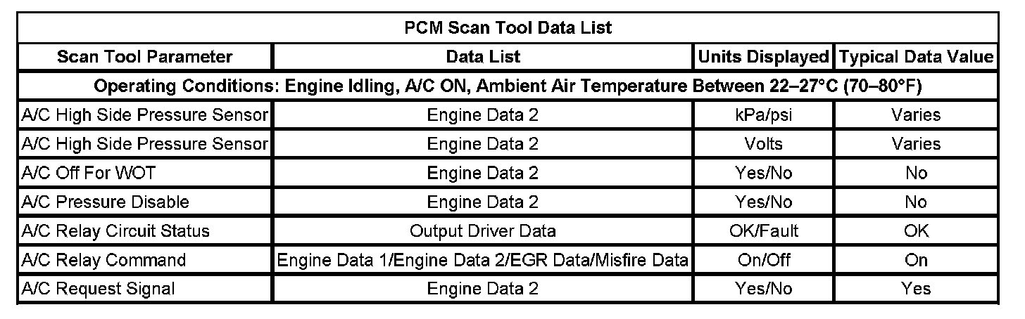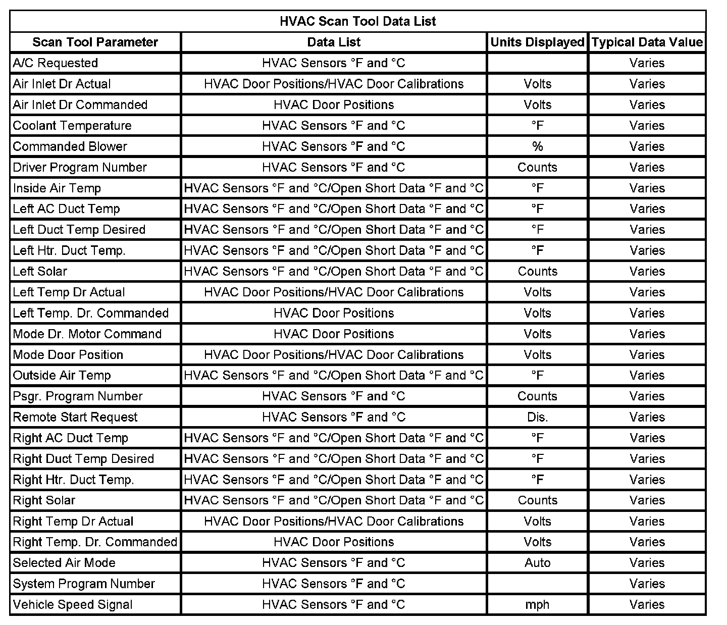 Use the Scan Tool Data Display Values and Definitions Information in order to assist in diagnosing the HVAC system. Compare the vehicles actual scan tool data with the typical data display value table information. Use the data information in order to aid in understanding the nature of the problem when the vehicle does not match with the typical data display values.