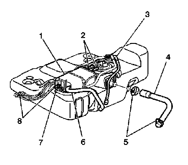 2. Disconnect the EVAP vent hose (6), the EVAP purge pipe (8), and the EVAP vapor pipe (7) from the EVAP canister (1).