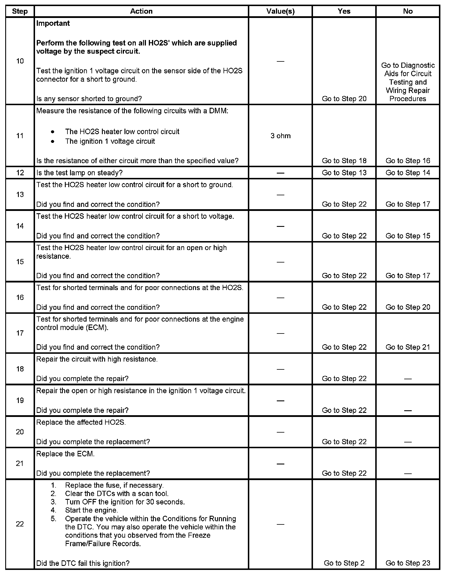 The heated oxygen sensor (HO2S) must reach operating temperature to provide an accurate voltage signal. A heating element inside the HO2S minimizes the time required for the sensor to reach operating temperature. Voltage is provided to the heater by the ignition 1 voltage circuit through a fuse. With the engine running, ground is provided to the heater by the HO2S heater low control circuit, through a low side driver within the engine control module (ECM). The ECM commands the heater ON or OFF to maintain a specific HO2S operating temperature range. The ECM determines the temperature by measuring the current flow through the heater. When the heater is in the ON state, the ECM will pulse the heater OFF for a duration of 50 ms, once per second. The ECM calculates the heater resistance on a cold start. This diagnostic will only run once per ignition cycle. If the ECM detects that the heater calculated resistance is not within the expected range, the following DTCs will set: