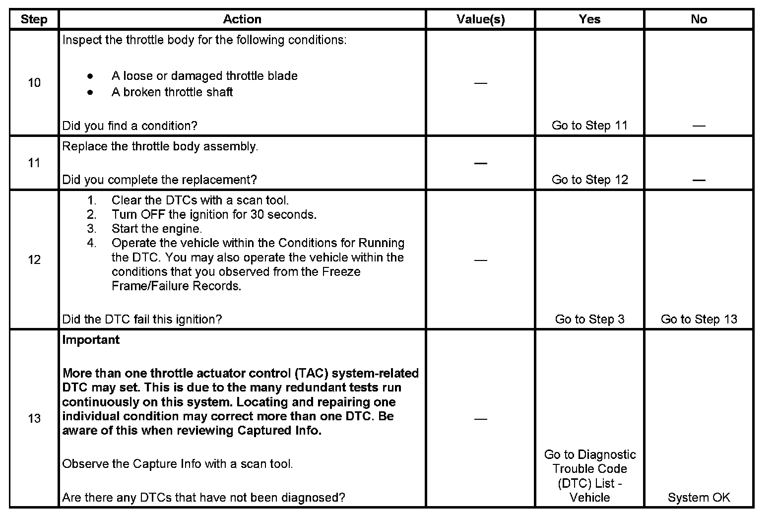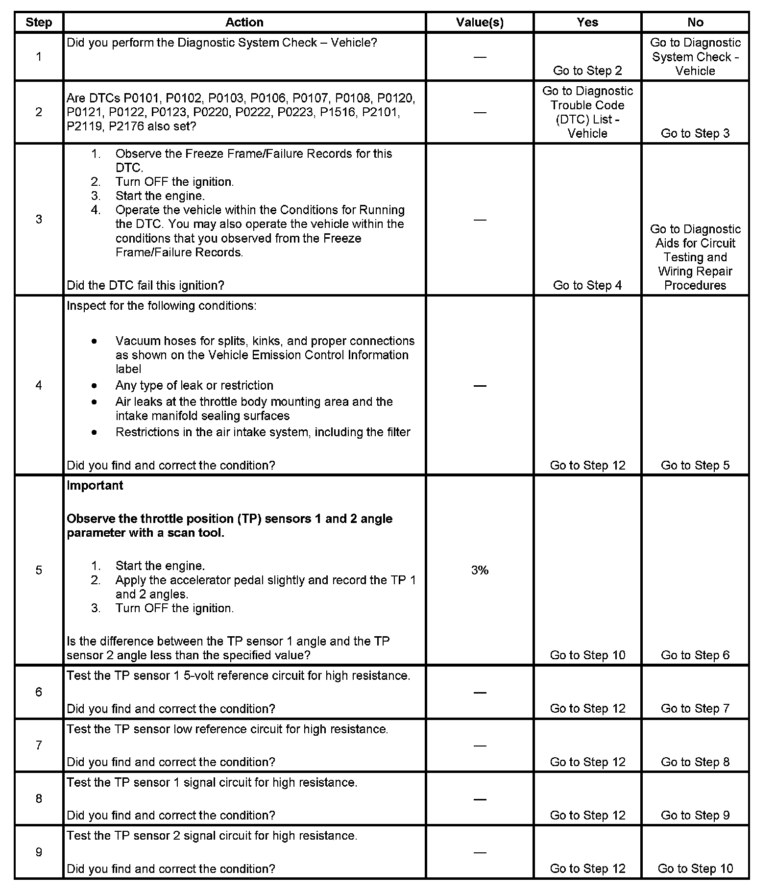 - DTCs P0101, P0102, P0103, P0106, P0107, P0108, P0120, P0121, P0122, P0123, P0220, P0221, P0222, P0223, P0601, P0602, P0603, P0604, P0606, P0607, P1516, P2101 are not set.