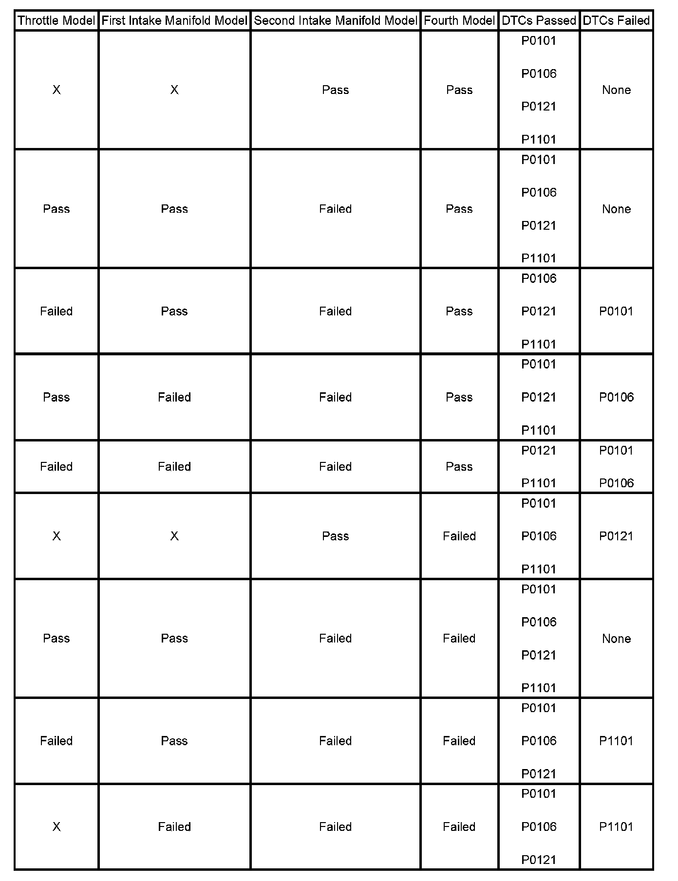 The estimates of MAF and MAP obtained from this system of models and calculations are then compared to the actual measured values from the MAF, MAP, and the TP sensors and to each other to determine the appropriate DTC to fail. The table illustrates the possible failure combinations and the resulting DTC or DTCs.
