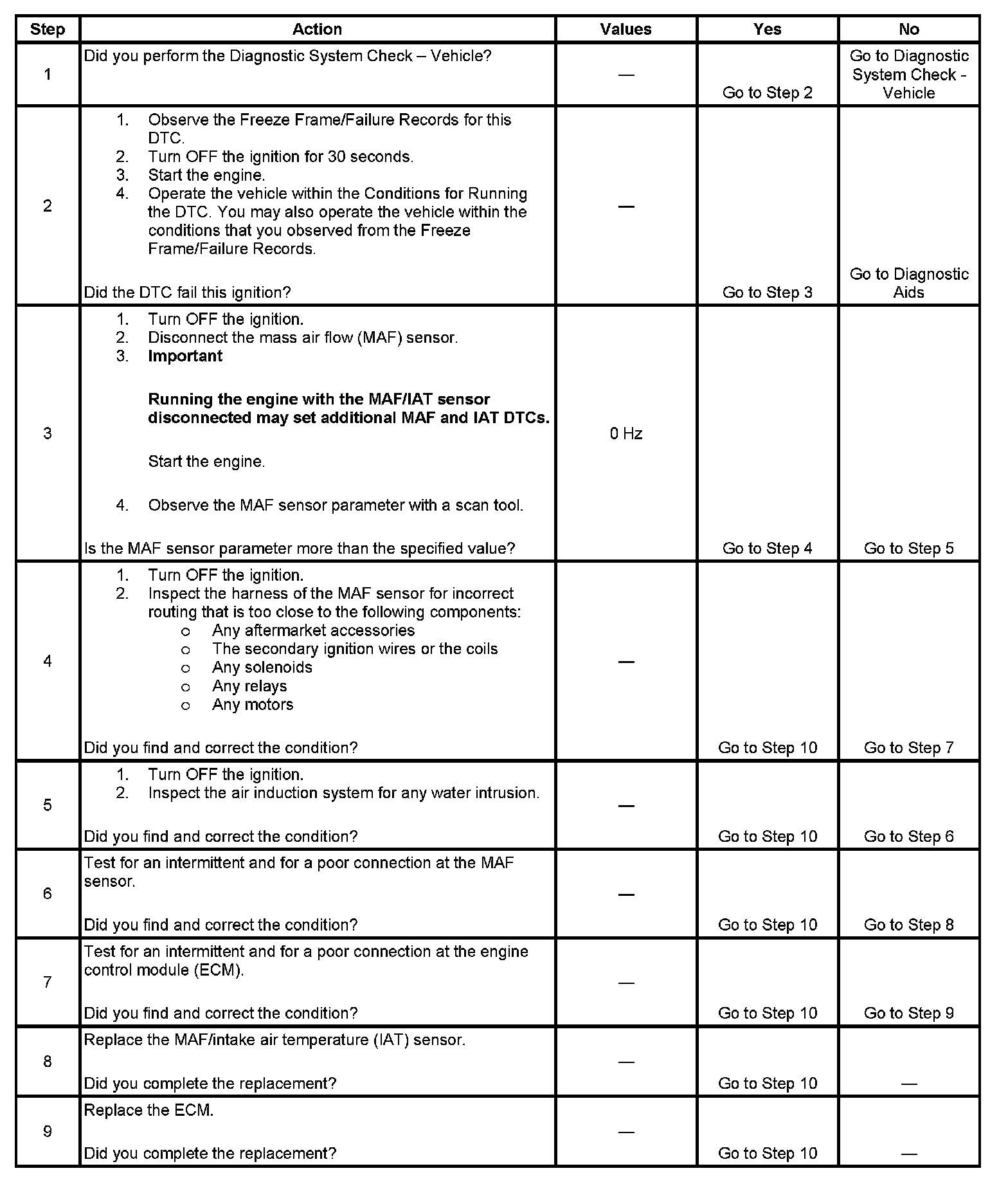 - Inspect the air induction system for any water intrusion. The water rapidly cools the hot sensing elements in the sensor causing a false indication of excessive air flow. Any water that reaches the MAF sensor will skew the sensor and may cause this DTC to set.