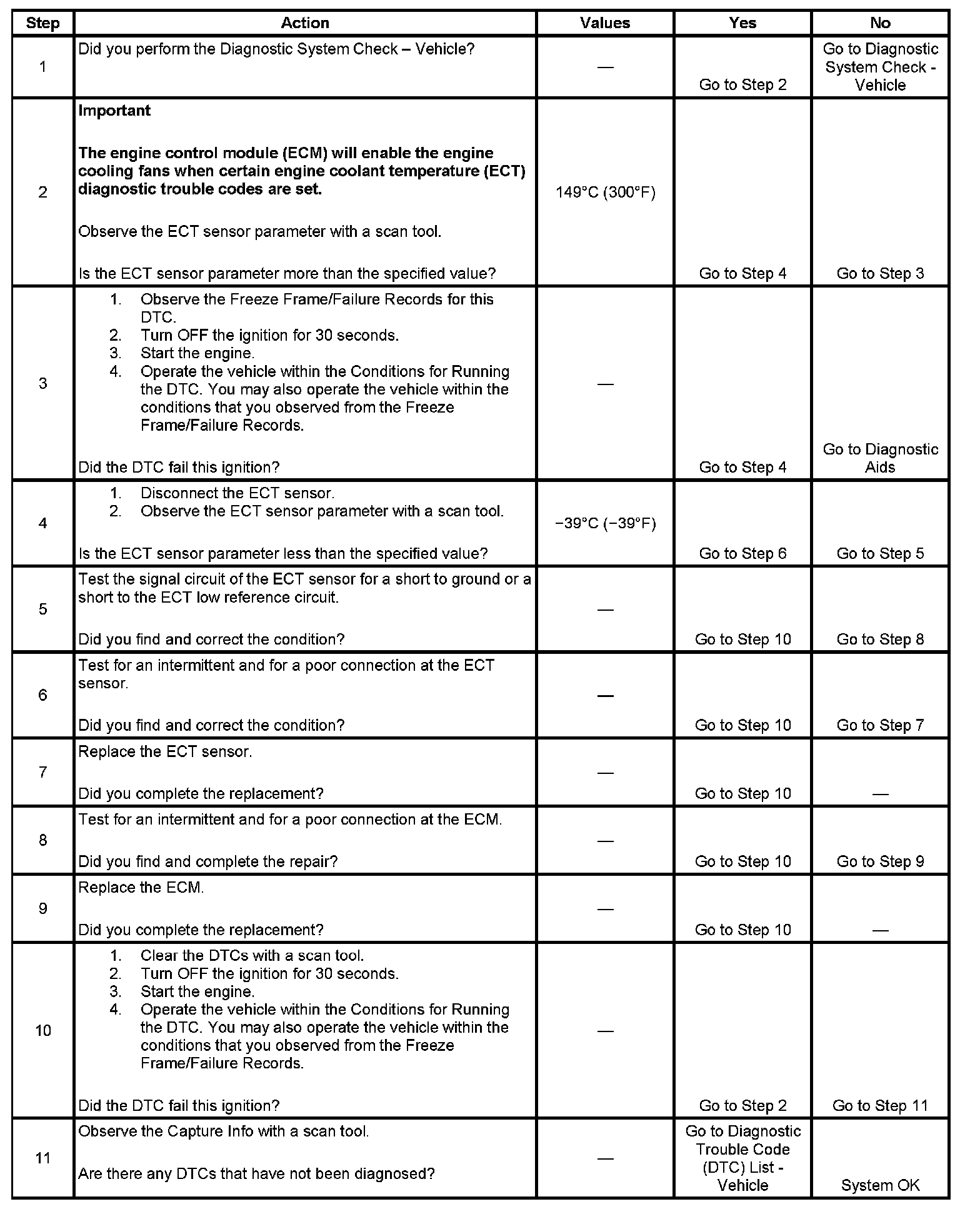The engine coolant temperature (ECT) sensor is a variable resistor, that measures the temperature of the engine coolant. The engine control module (ECM) supplies 5 volts to the ECT signal circuit and a ground for the ECT low reference circuit. When the ECT is cold, the sensor resistance is high. When the ECT increases, the sensor resistance decreases. With high sensor resistance, the ECM detects a high voltage on the ECT signal circuit. With lower sensor resistance, the ECM detects a lower voltage on the ECT signal circuit. If the ECM detects an excessively low ECT signal voltage, which is a high temperature indication, DTC P0117 sets.