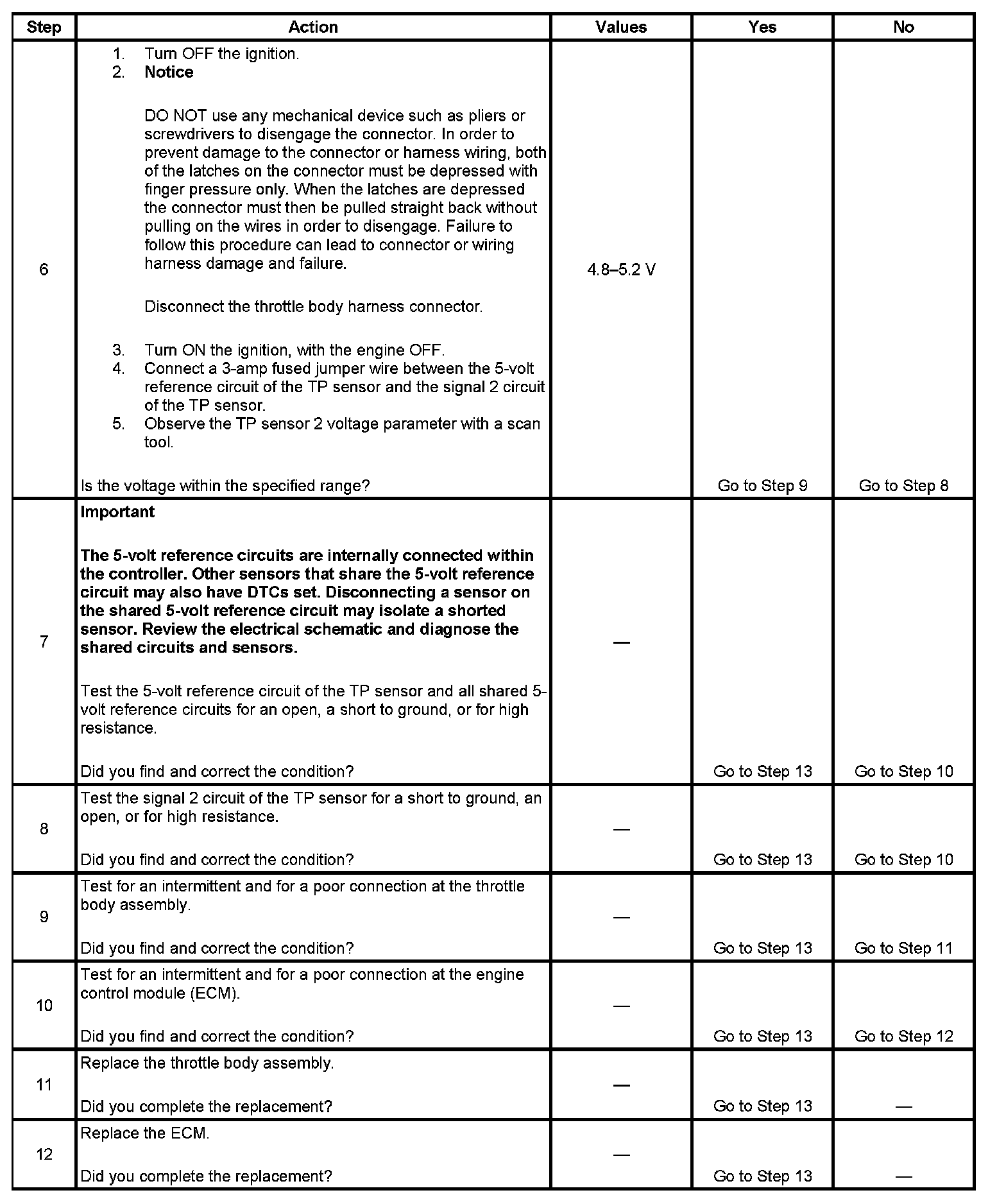 6. This step tests the signal 2 circuit of the TP sensor. If the TP sensor 2 voltage parameter is not within 4.8-5.2 volts, test for a condition in the signal 2 circuit.