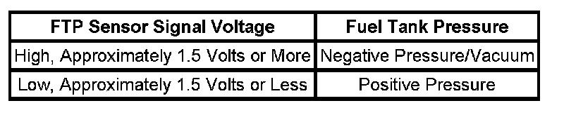 The table illustrates the relationship between the FTP sensor signal voltage and the EVAP system pressure/vacuum.