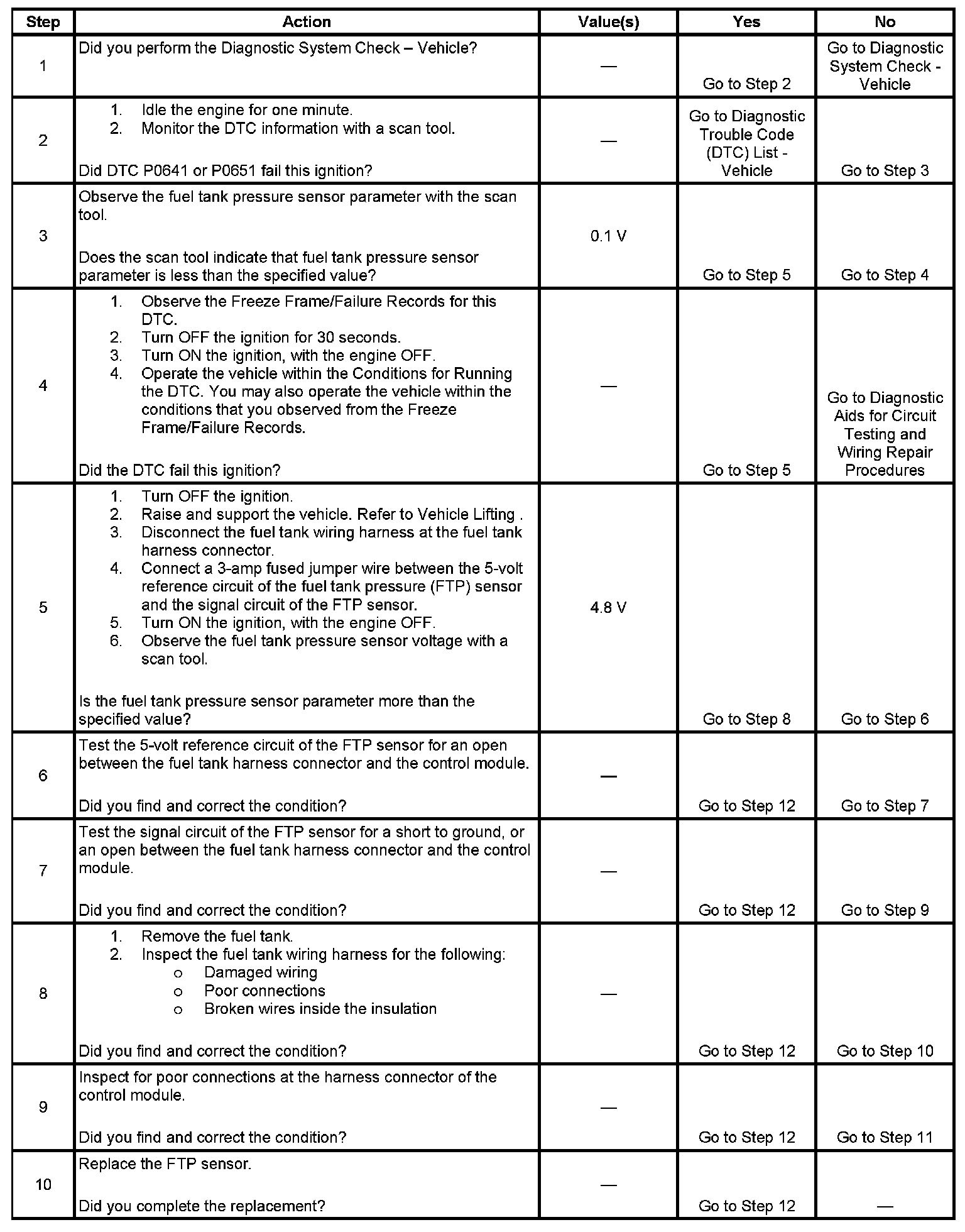 The fuel tank pressure (FTP) sensor measures the difference between the air pressure or vacuum in the evaporative emission (EVAP) system, and the outside air pressure. The control module supplies a 5-volt reference and a low reference circuit to the FTP sensor. The FTP sensor signal circuit voltage varies depending on EVAP system pressure or vacuum. If the FTP sensor signal voltage goes below a calibrated value, this DTC sets.