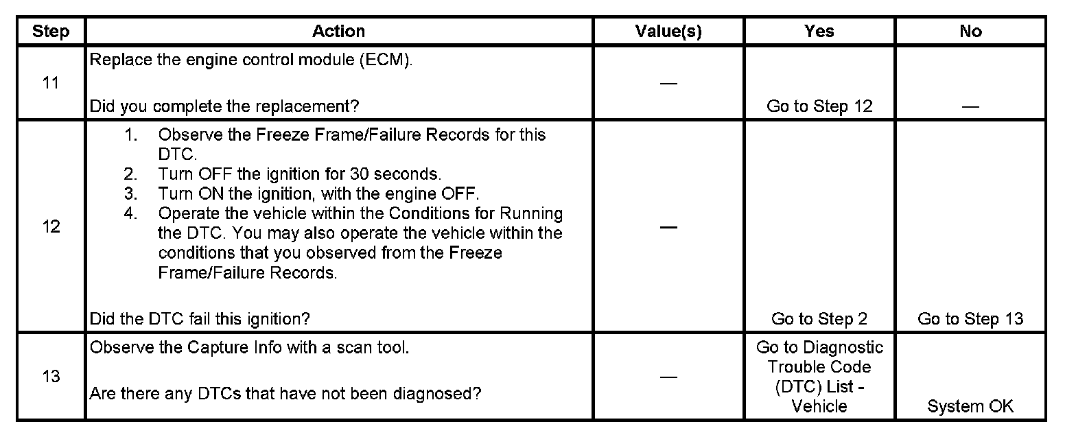 - The control module records the operating conditions at the time the diagnostic fails. The first time the diagnostic fails, the control module stores this information in the Failure Records. If the diagnostic reports a failure on the second consecutive ignition cycle, the control module records the operating conditions at the time of the failure. The control module writes the operating conditions to the Freeze Frame and updates the Failure Records.
