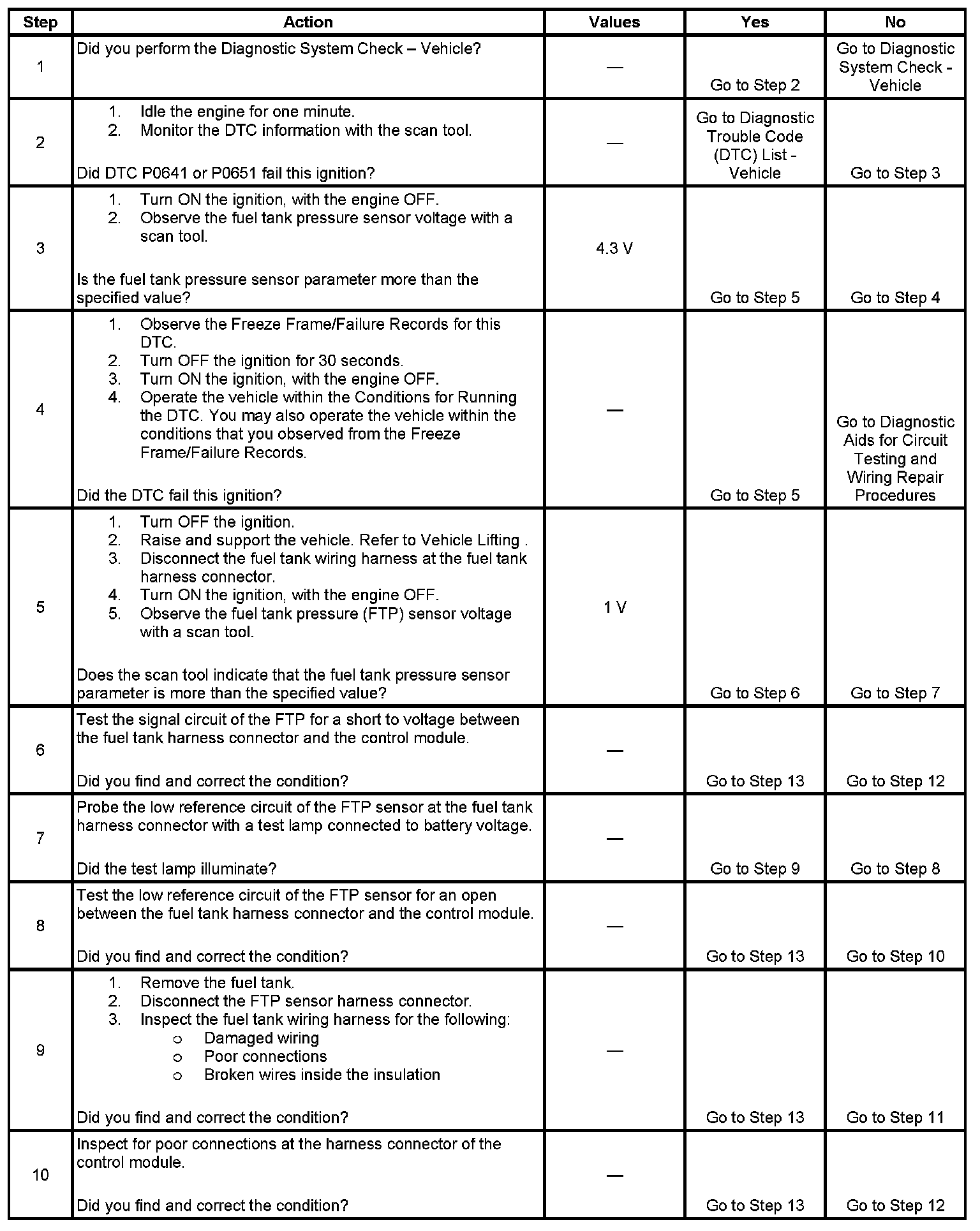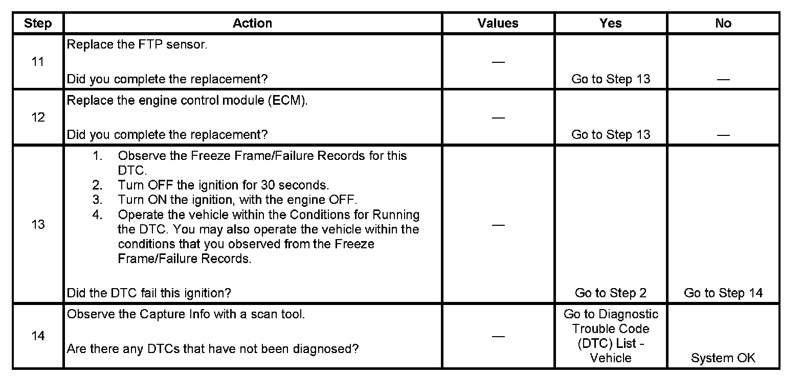 The fuel tank pressure (FTP) sensor measures the difference between the air pressure or vacuum in the evaporative emission (EVAP) system, and the outside air pressure. The control module supplies a 5-volt reference and a low reference circuit to the FTP sensor. The FTP sensor signal circuit voltage varies depending on EVAP system pressure or vacuum. If the FTP sensor signal voltage increases above a calibrated value, this DTC sets.