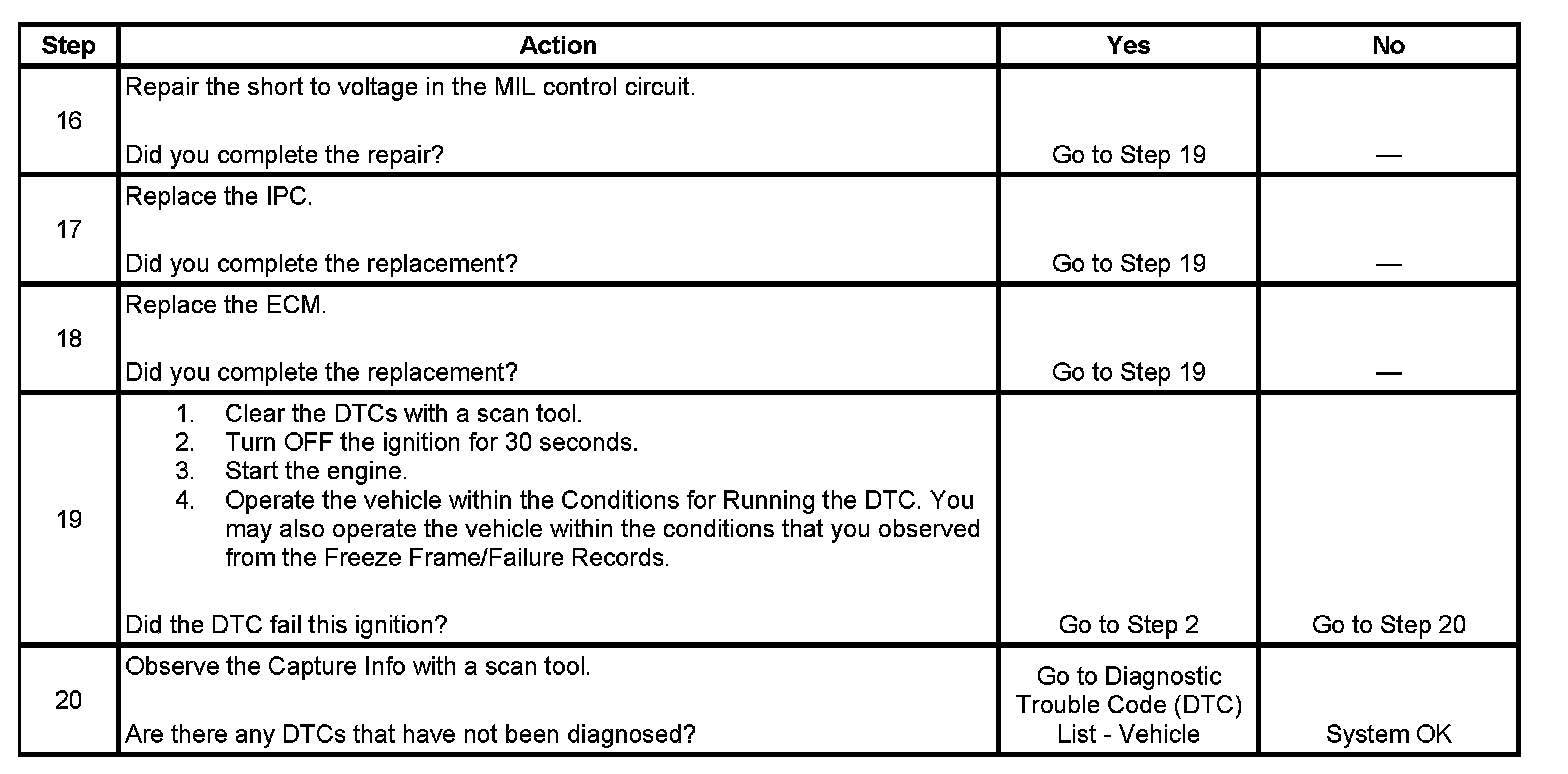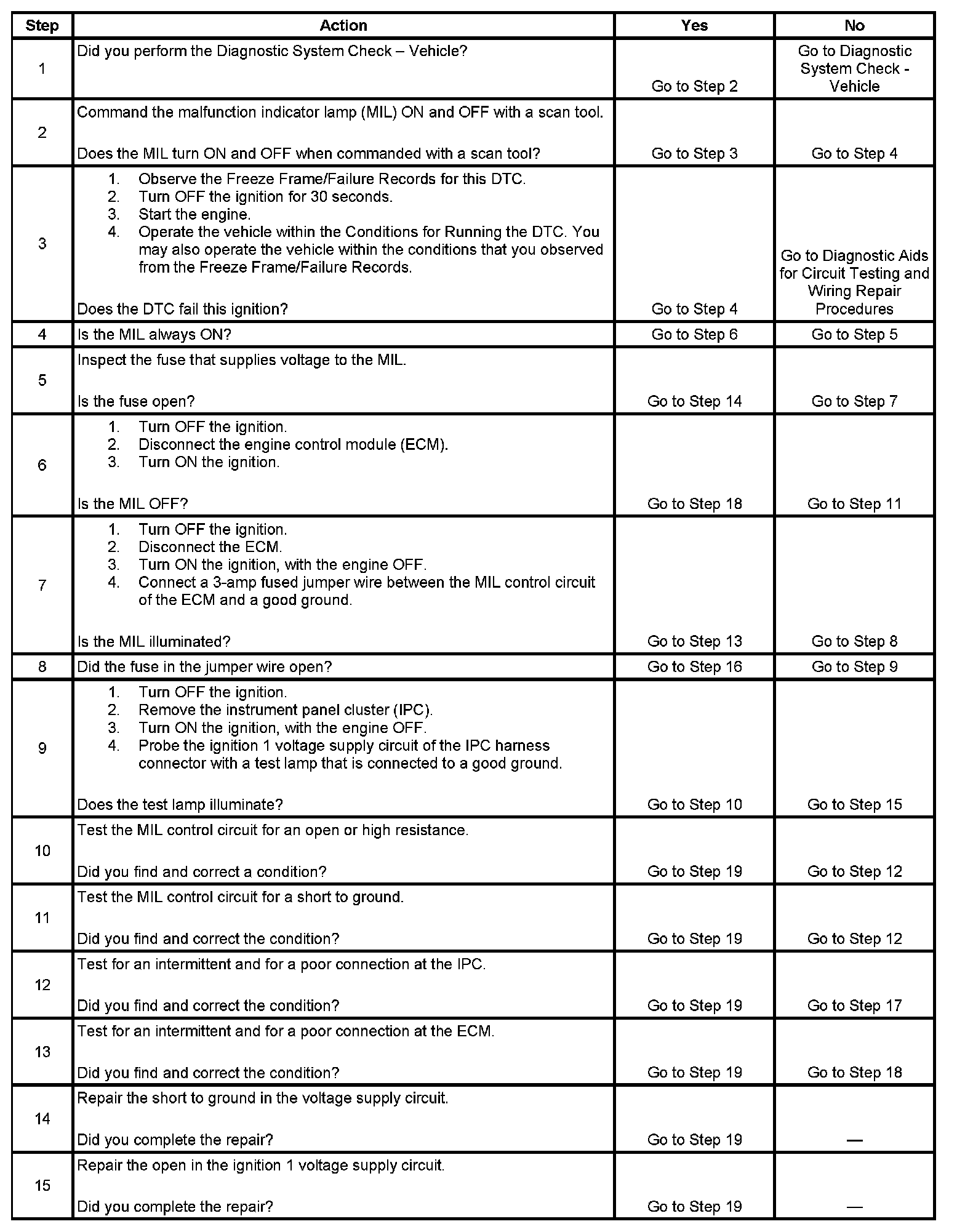 6. This step tests for a short to ground in the MIL control circuit. With the engine control module (ECM) disconnected and the ignition ON, the MIL should be OFF.