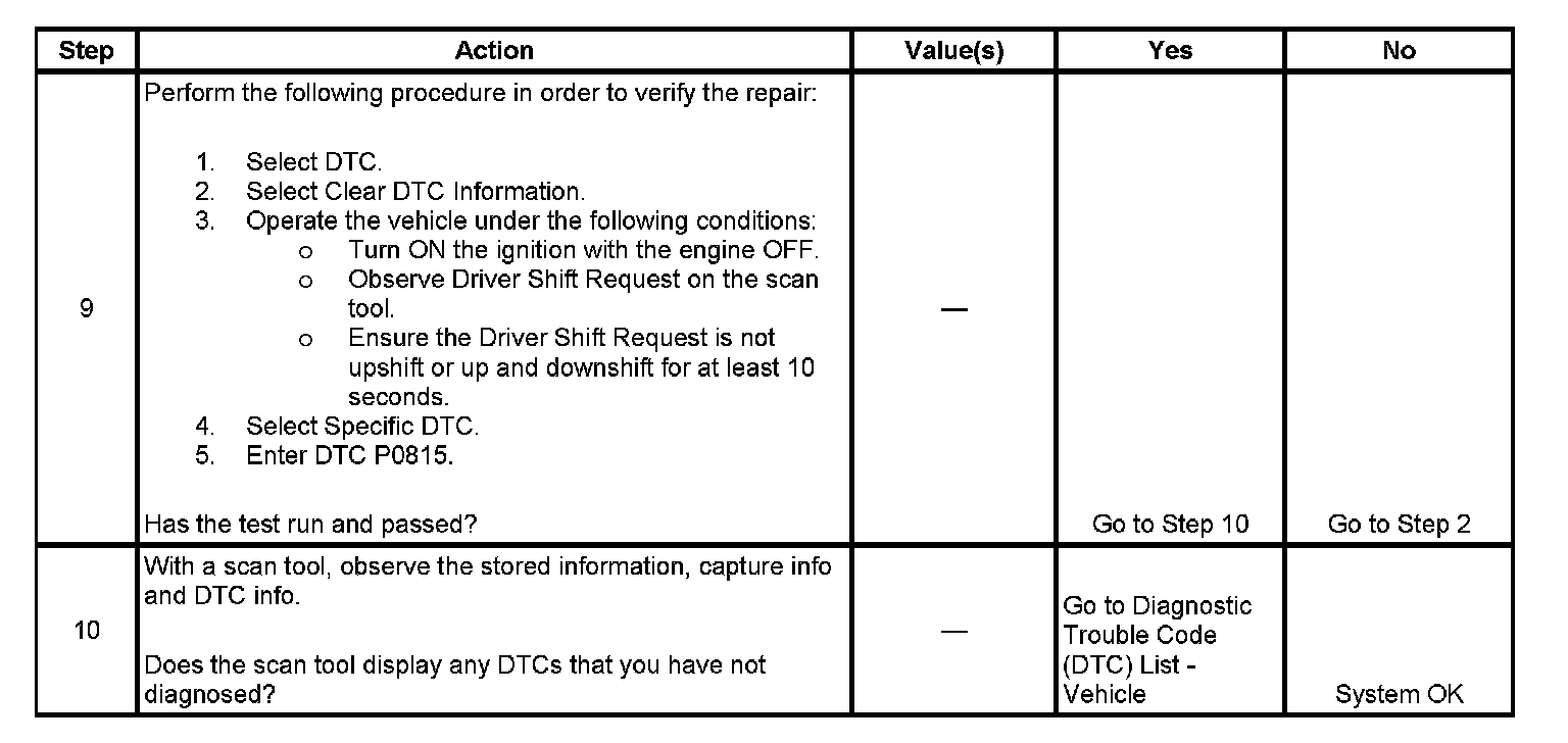 If the TCM detects an upshift or an up and downshift request for an extended period of time, then DTC P0815 sets. DTC P0815 is a type C DTC.