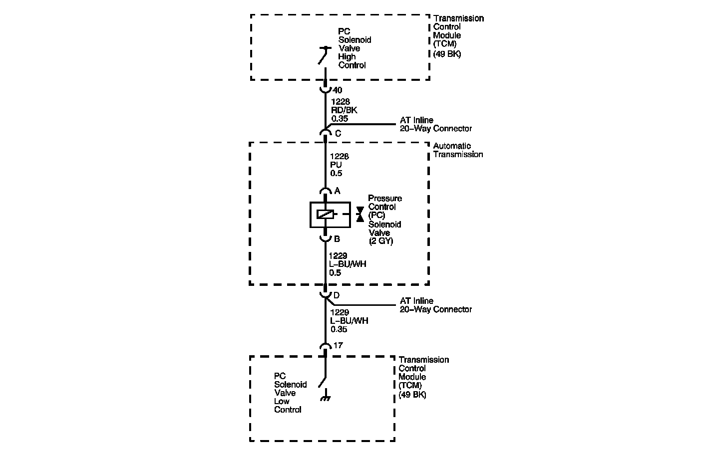 The pressure control (PC) solenoid valve is located in the valve body. The PC solenoid valve controls transmission line pressure based on current flow through its windings. The transmission control module (TCM) determines desired line pressure based on throttle position and other inputs. The TCM then varies the duty cycle on the high side of the PC solenoid valve to control current flow to the solenoid. Current is controlled from about 0.02 amps for maximum line pressure to 1.1 amps for minimum line pressure. The TCM monitors the actual current to the solenoid.