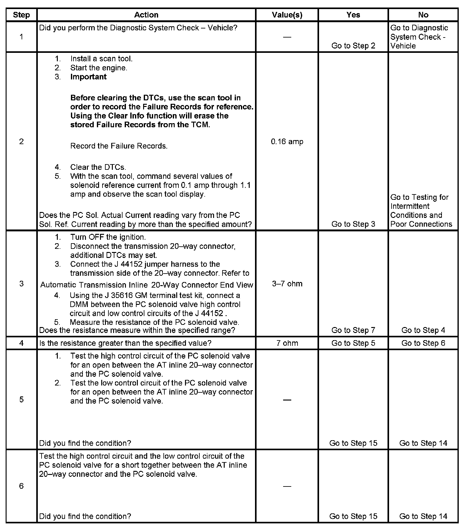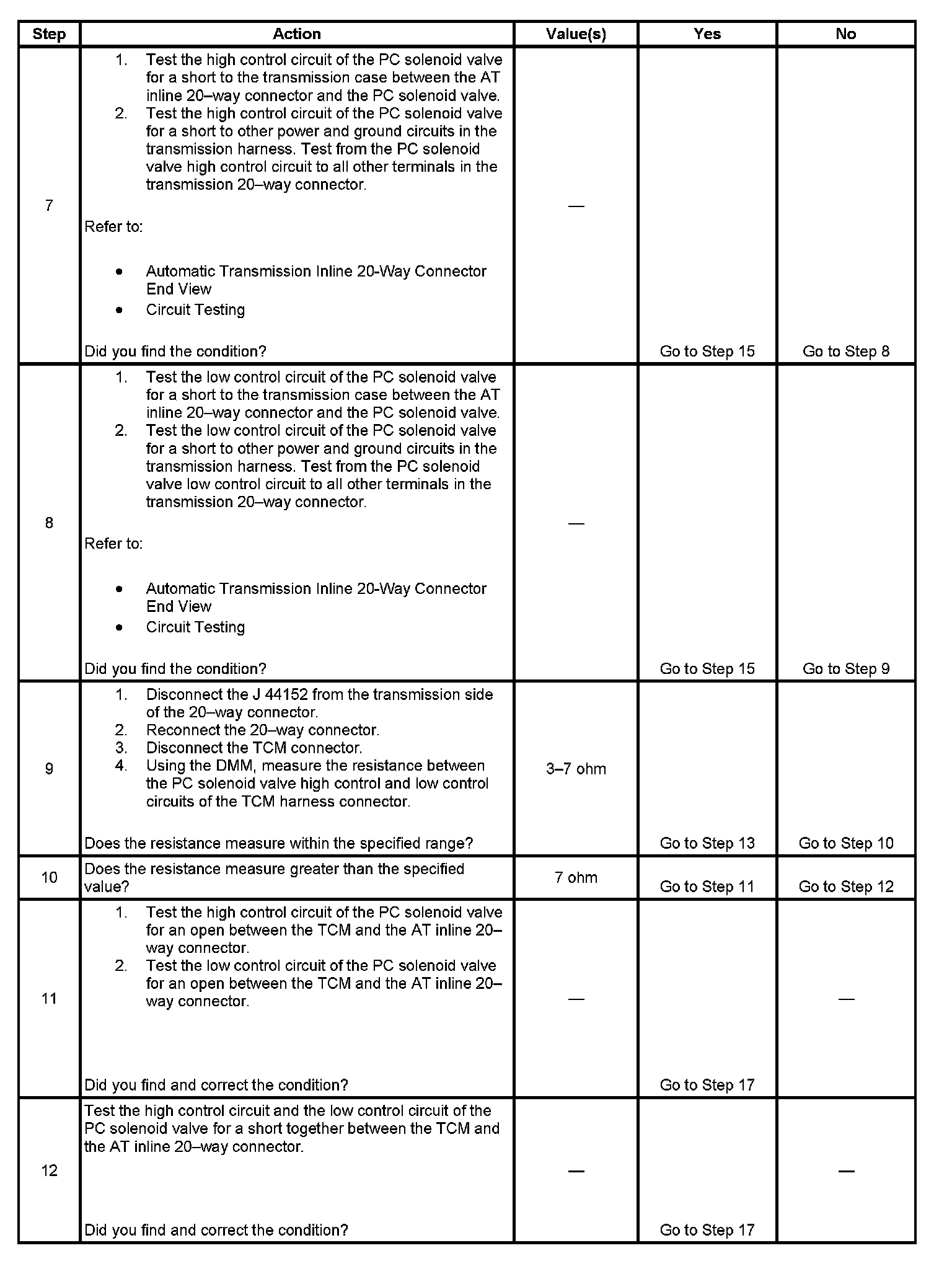 3. This step tests the transmission wiring harness and the PC solenoid valve for correct resistance.