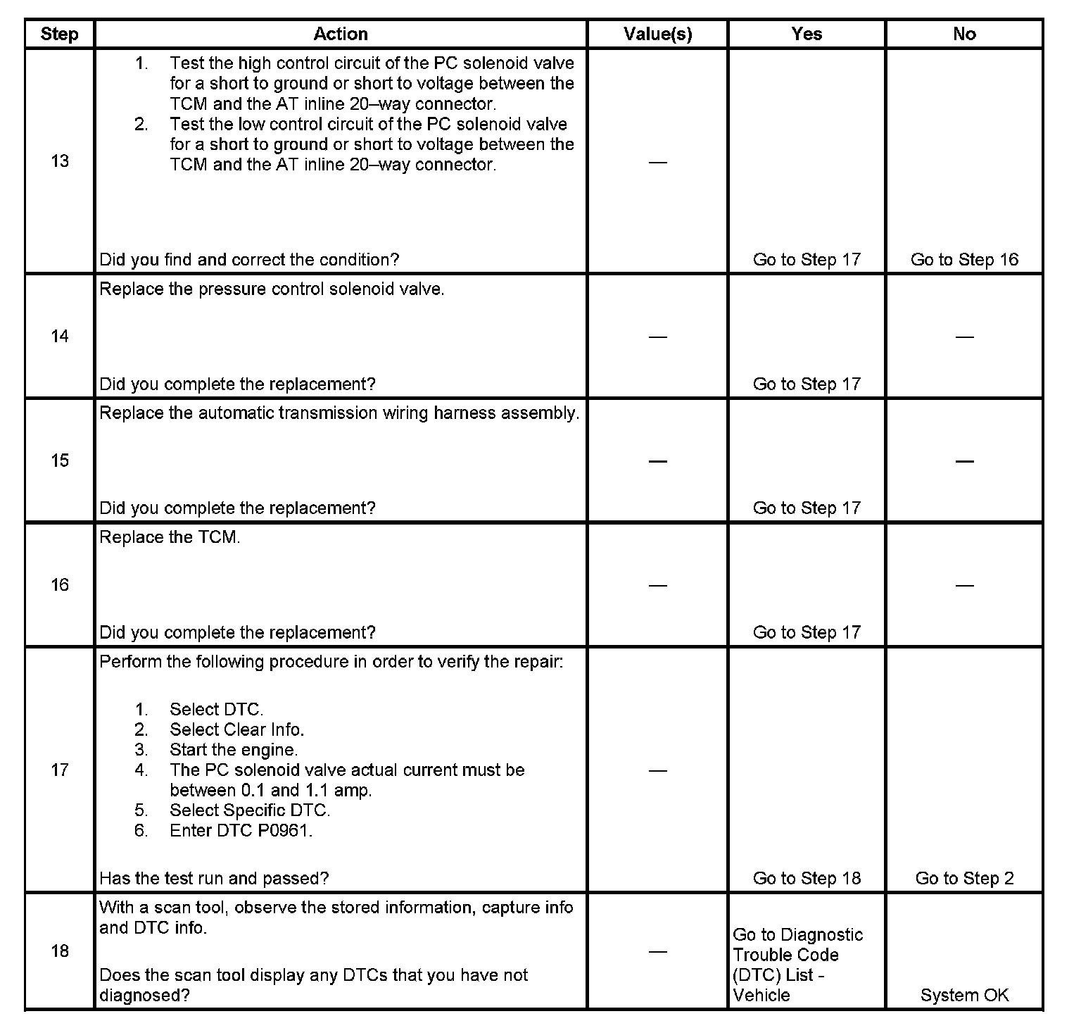 If the TCM detects a commanded current draw that differs from the actual current draw by more than a calibrated value, then DTC P0961 sets. DTC P0961 is a type C DTC.