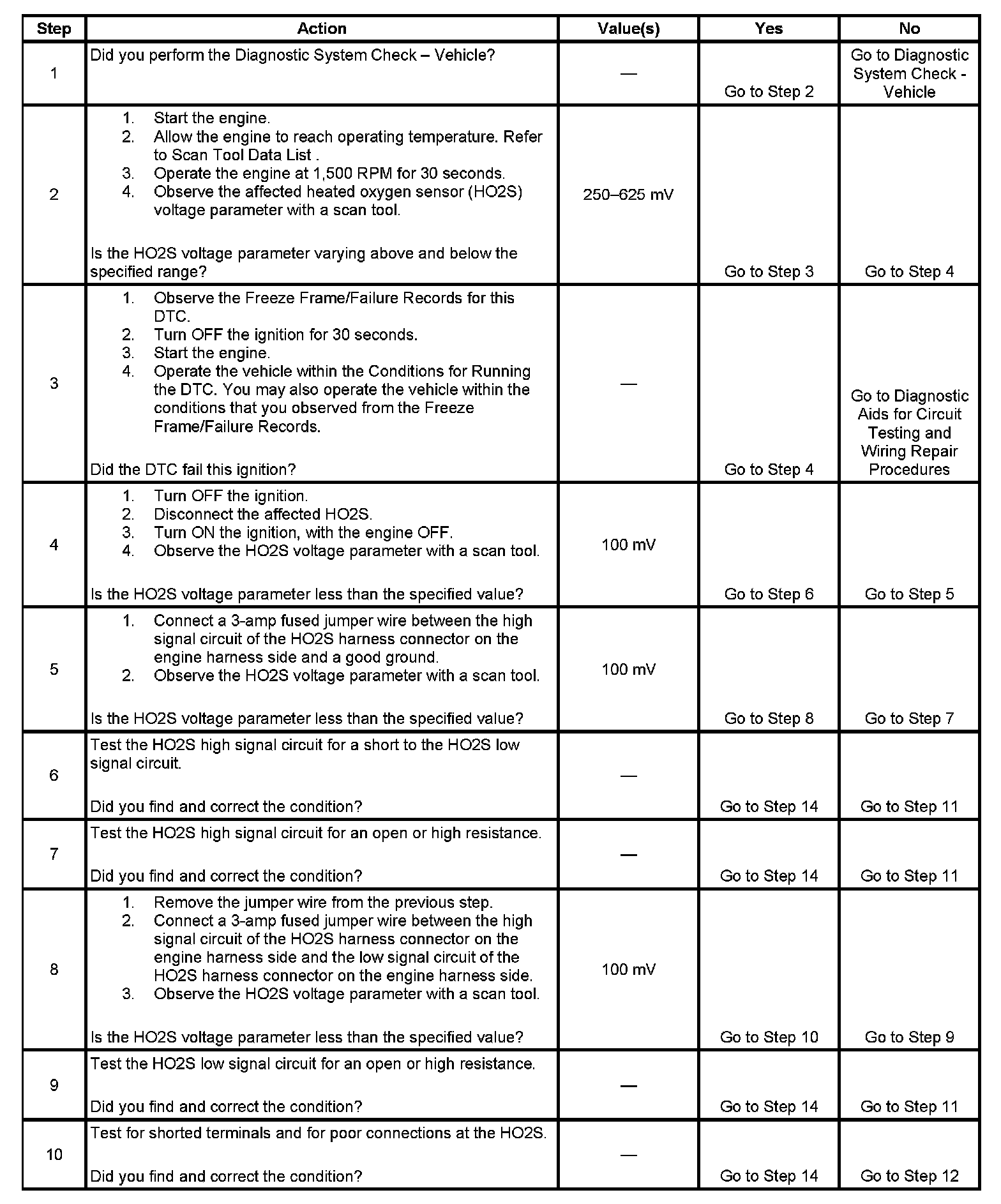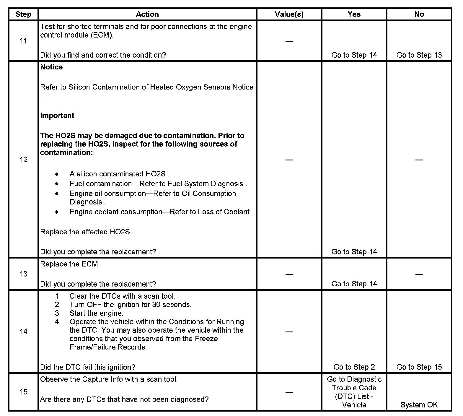 Heated oxygen sensors (HO2S) are used for fuel control and post catalyst monitoring. Each HO2S compares the oxygen content of the surrounding air with the oxygen content in the exhaust stream. The HO2S must reach operating temperature to provide an accurate voltage signal. Heating elements inside the HO2S minimize the time required for the sensors to reach operating temperature. The engine control module (ECM) supplies the HO2S with a reference, or bias, voltage of about 450 mV. When the engine is first started the ECM operates in Open Loop, ignoring the HO2S voltage signal. Once the HO2S reaches operating temperature and Closed Loop is achieved, the HO2S generates a voltage within a range of 0-1,000 mV that fluctuates above and below bias voltage. High HO2S voltage indicates a rich exhaust stream. Low HO2S voltage indicates a lean exhaust stream. This diagnostic will only run once per ignition cycle. The ECM monitors the number of rich-to-lean and lean-to-rich transitions. If the ECM detects that the number of transitions were less than a specified value, DTC P1133 sets for HO2S sensor 1.