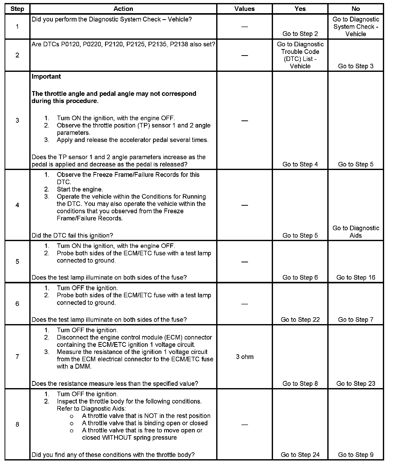 The commanded throttle position is compared to the actual throttle position based on accelerator pedal position (APP) and possibly other limiting factors. Both values should be within a calibrated range of each other. The engine control module (ECM) continuously monitors the commanded and actual throttle positions. This DTC sets if the values are greater than the calibrated range.