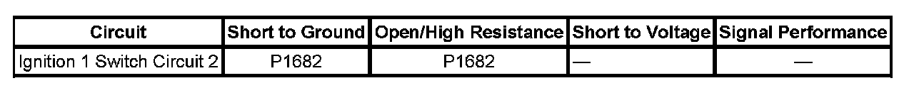 There are 2 ignition 1 voltage circuits supplied to the engine control module (ECM). The first ignition 1 voltage circuit is provided by the powertrain relay, through the ETC/ECM fuse, located in the underhood fuse block. This ignition 1 voltage circuit supplies power to all the internal ECM circuits associated with the throttle actuator control (TAC) operation, and to both TAC motor control circuits to the throttle body. The ignition main relay provides the second ignition 1 voltage circuit to the ECM, through the ECM IGN fuse located in the underhood fuse block. This ignition 1 voltage provides power to all internal ECM circuits, except those associated with TAC operation. The ECM continuously monitors both ignition 1 voltage circuits. If the ECM detects a voltage level difference between the two circuits, DTC P1682 will set.