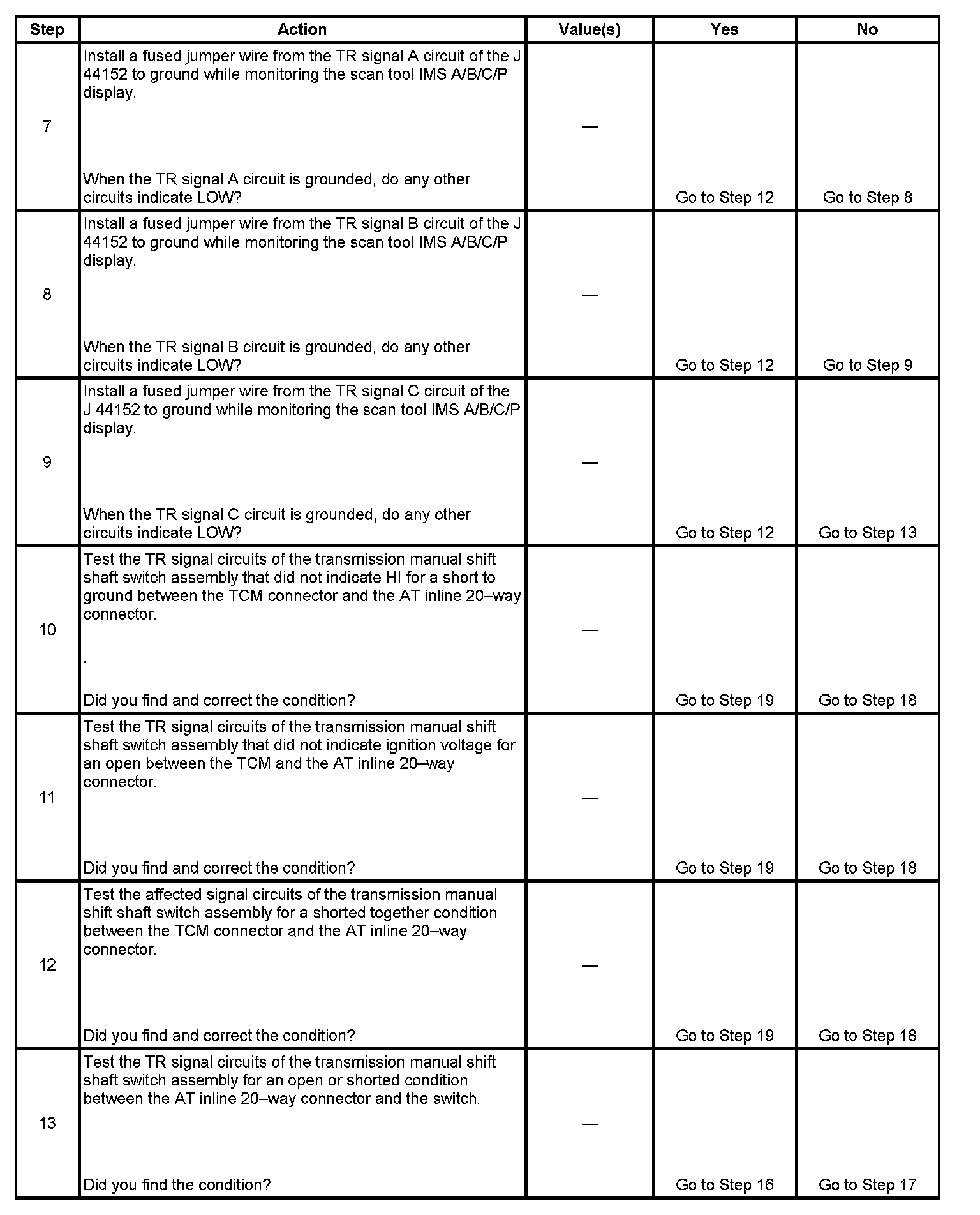 13. This step tests the internal transmission harness. If no fault is found in the harness, the fault will be in the switch.