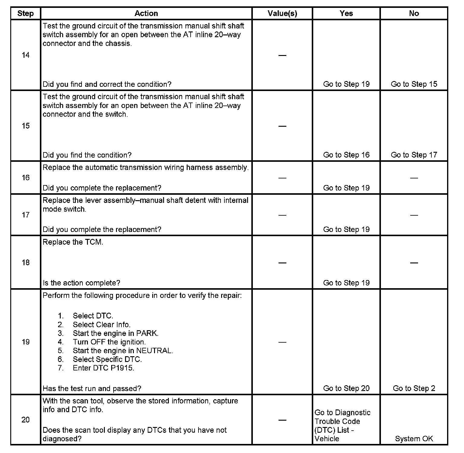 If the TCM detects an invalid switch state while the engine is being started, then DTC P1915 sets. DTC P1915 is a type B DTC.