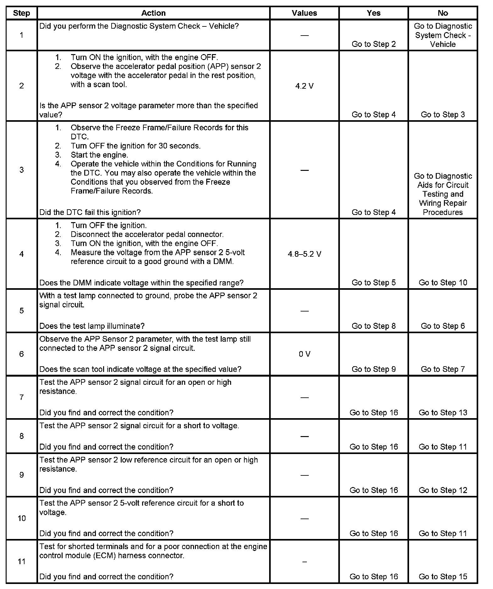 The APP sensor 1 signal voltage increases as the pedal is depressed, from approximately 1 volt at rest to above 2.5 volts when fully depressed. The APP sensor 2 signal voltage decreases as the pedal is depressed, from approximately 4 volts at rest to less than 1 volt with the accelerator pedal fully depressed. If the ECM detects that the APP sensor 2 signal voltage is too high, this DTC sets.