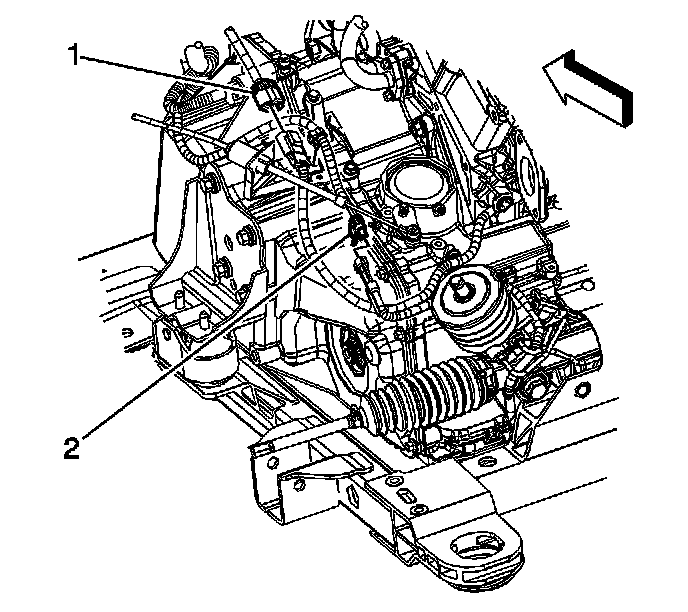 89. Remove the transaxle to engine bolts (1) and stud (2).