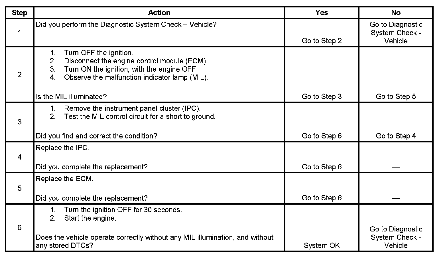 2. This step determines if the condition is with the MIL control circuit or the ECM.