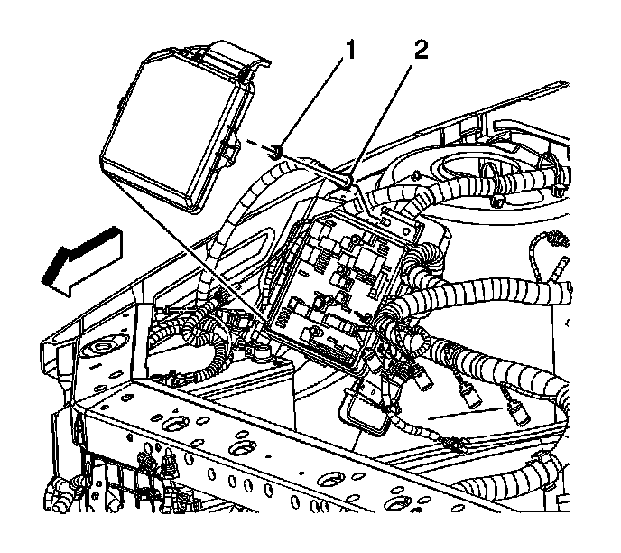 8. Remove the positive battery lead terminal (2) from the bussed electrical center (BEC).