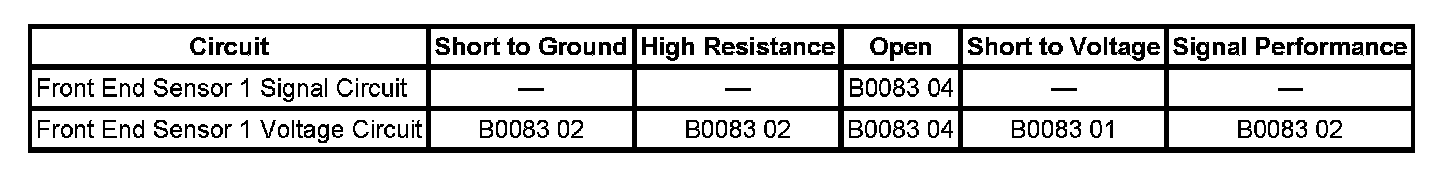 - If DTC B0083 was current replace the front end sensor. After replacement refer to Repair Verification.