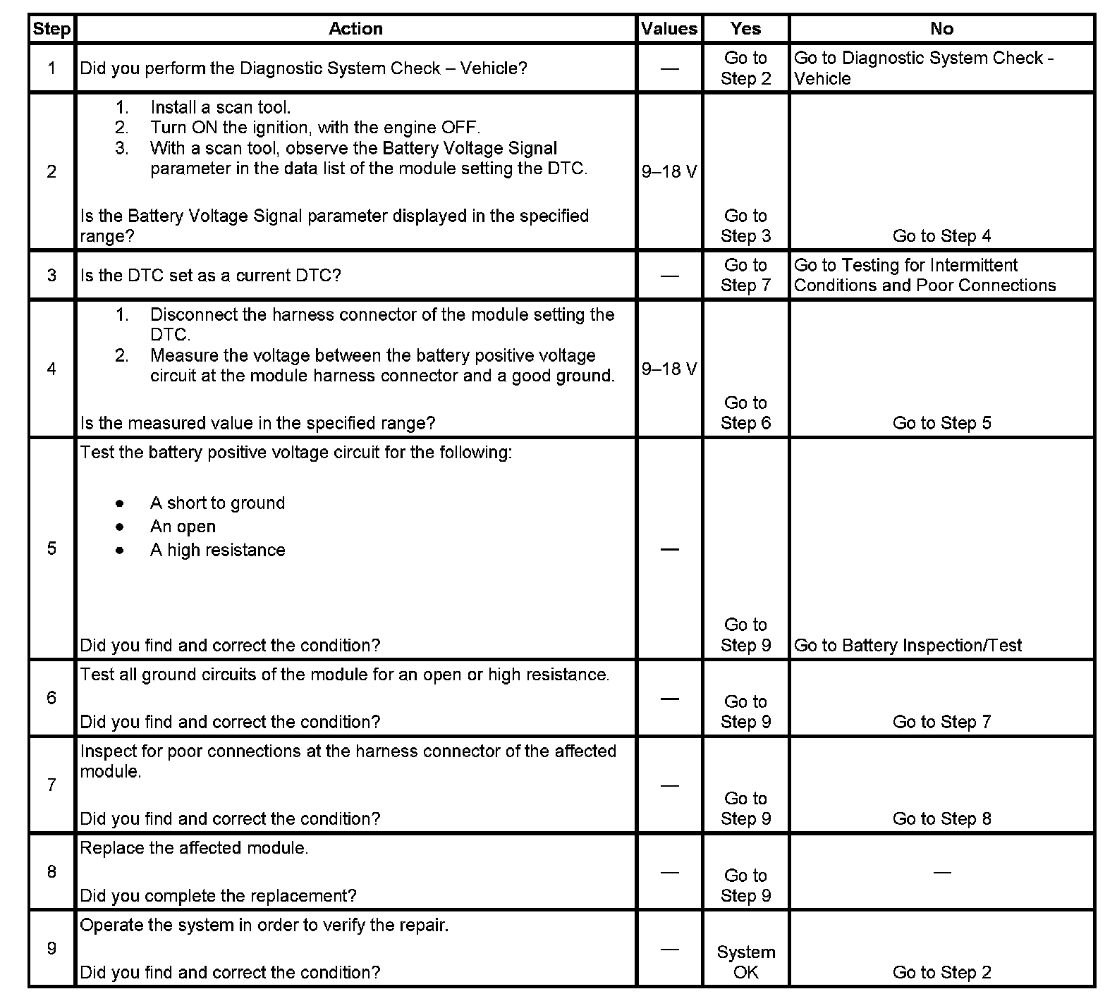 The control module detects a system voltage below 9 volts and the condition is present at least 5 seconds.