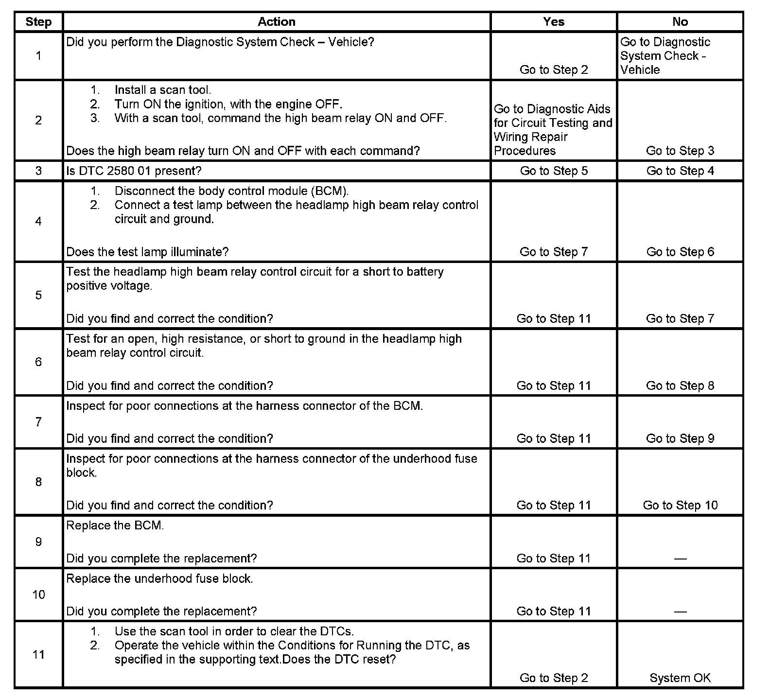 The high beam relay is controlled by the body control module (BCM). The BCM provides ground to the high beam relay control circuit in order to turn ON the high beam relay. When the high beam relay control circuit opens, becomes shorted to voltage, or becomes shorted to ground without being commanded ON by the BCM, DTC B2580 is set.