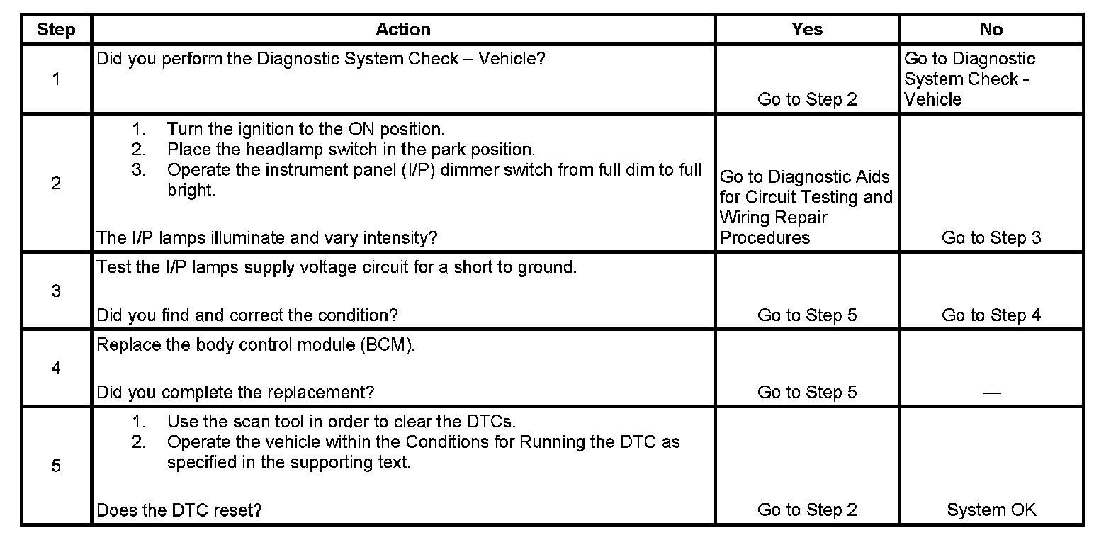 The body control module (BCM) monitors the instrument panel (I/P) lamps dimming control circuit to determine the lighting intensity of the I/P lamps. When the BCM receives a varied voltage signal on the I/P lamps dimming control circuit, it applies a corresponding pulse width modulated (PWM) voltage signal through the I/P lamps supply voltage circuit to all the I/P lamps.