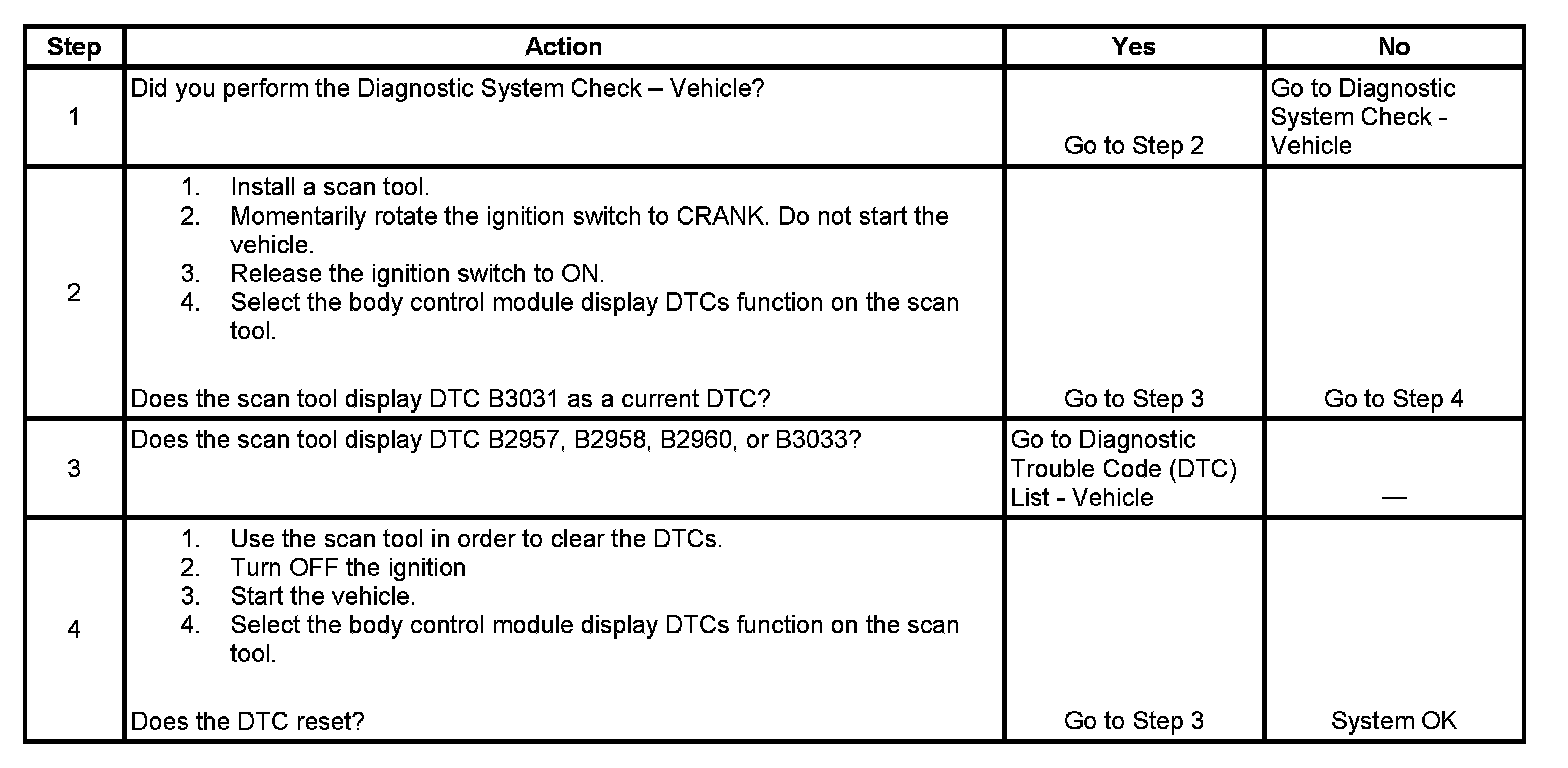 - If DTC B3031 is set in the BCM as a history DTC, clear the DTC and recheck the system. A history DTC B3031 indicates that the BCM has successfully completed the programming mode.
