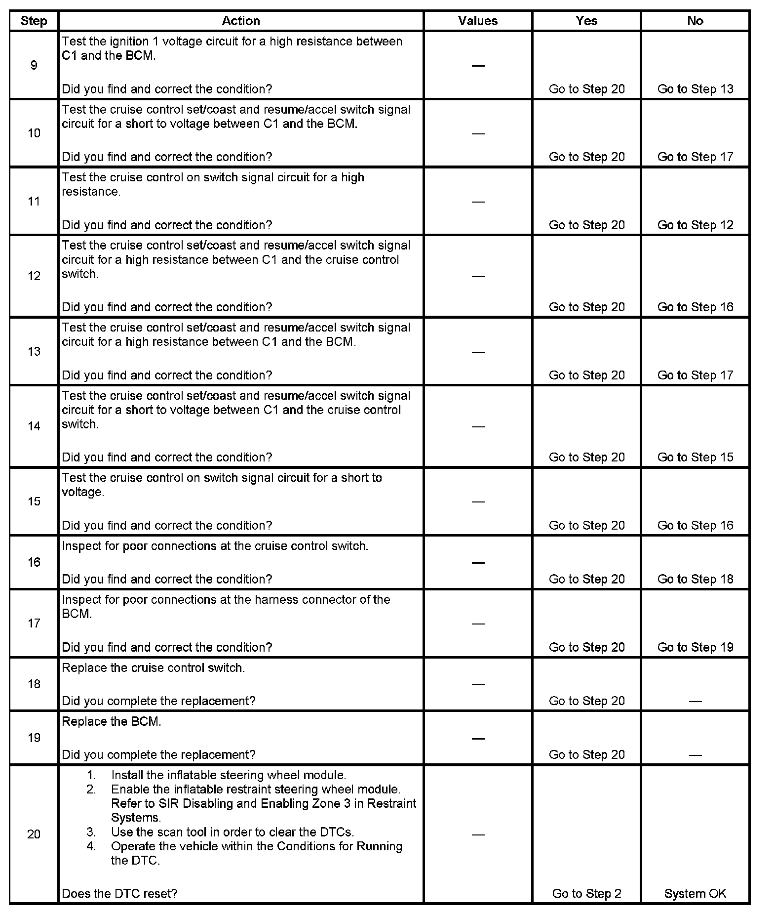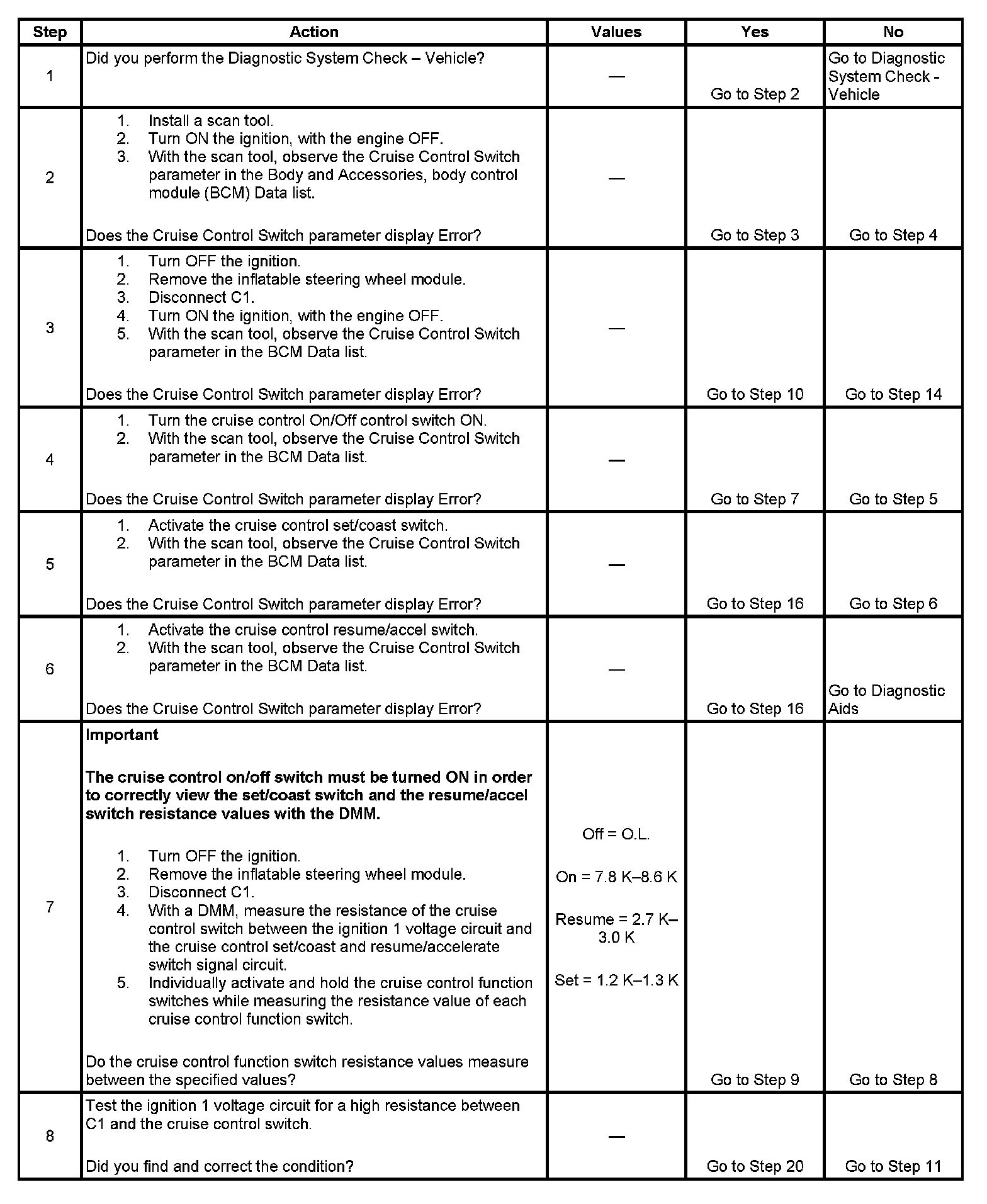 - Rotate the steering wheel to both steering stops and activate each cruise control switch separately. With a scan tool, observe the Cruise Control Switch parameter in the Body and Accessories, BCM Data list. This will help eliminate the possibility of a internally open or shorted inflatable restraint steering wheel module coil.