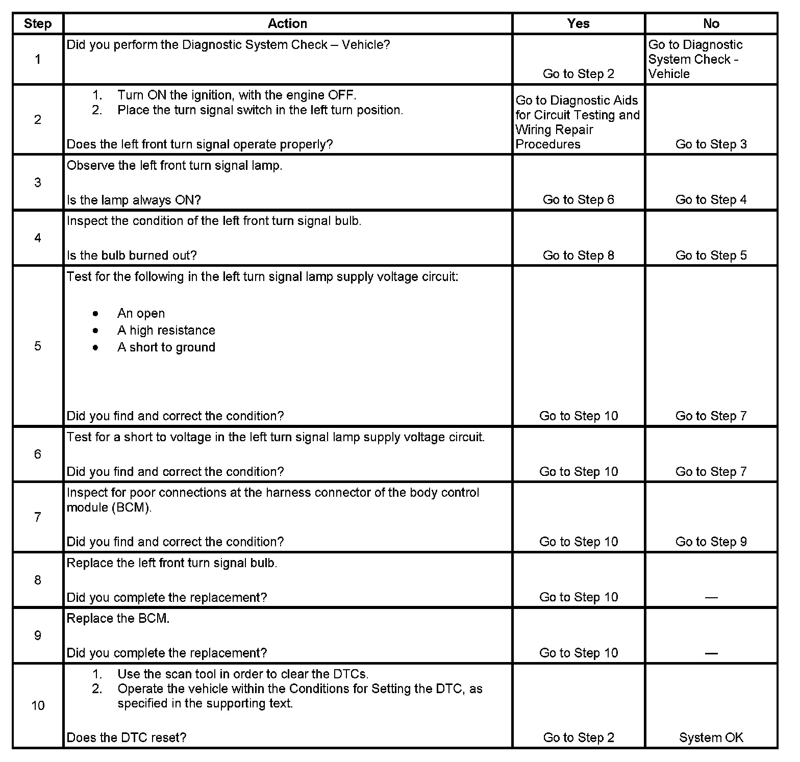 - The BCM no longer detects continuous battery voltage on the LH turn signal monitor circuit for longer than 5 seconds.