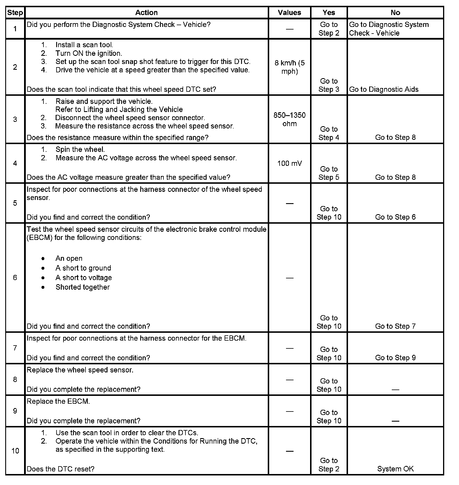 ^ An open - the wheel speed sensor signal circuit voltage is greater than 4.25 volts and wheel speed sensor return circuit voltage is less than 0.75 volts.