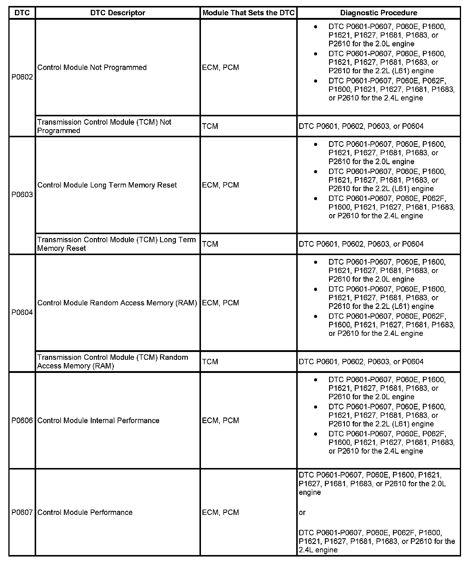 DTCs P0602 - P0607: