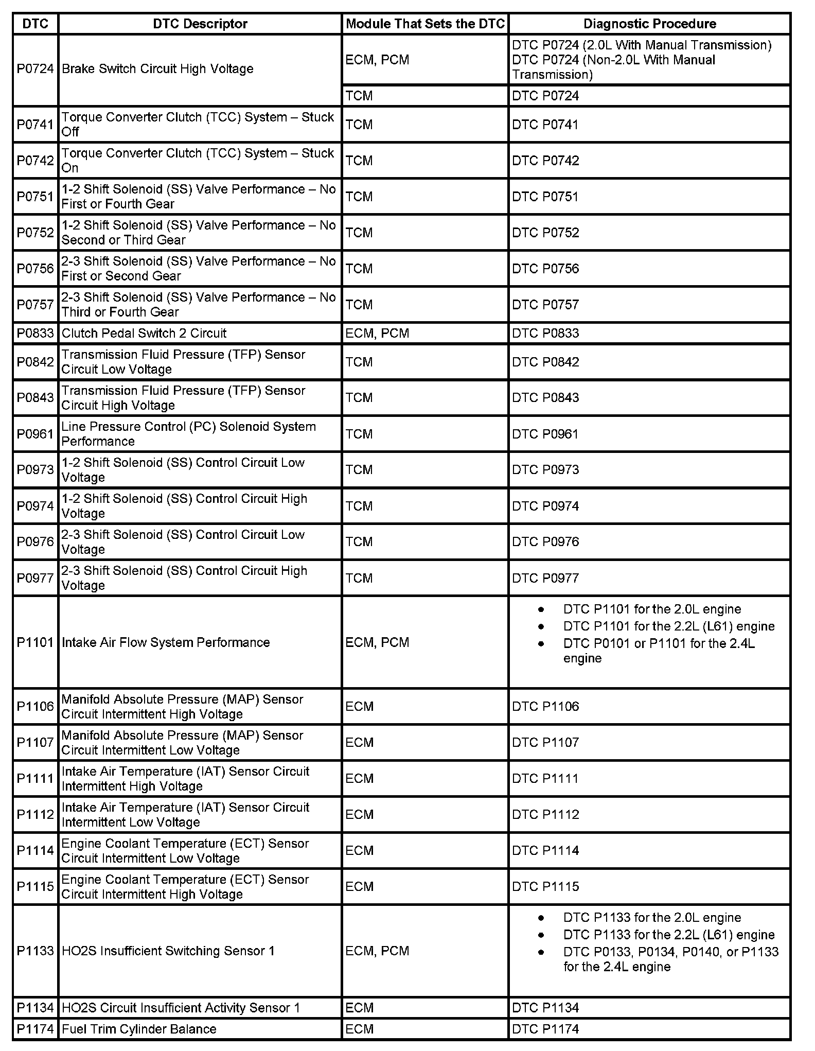 DTCs P0724 - P1174: