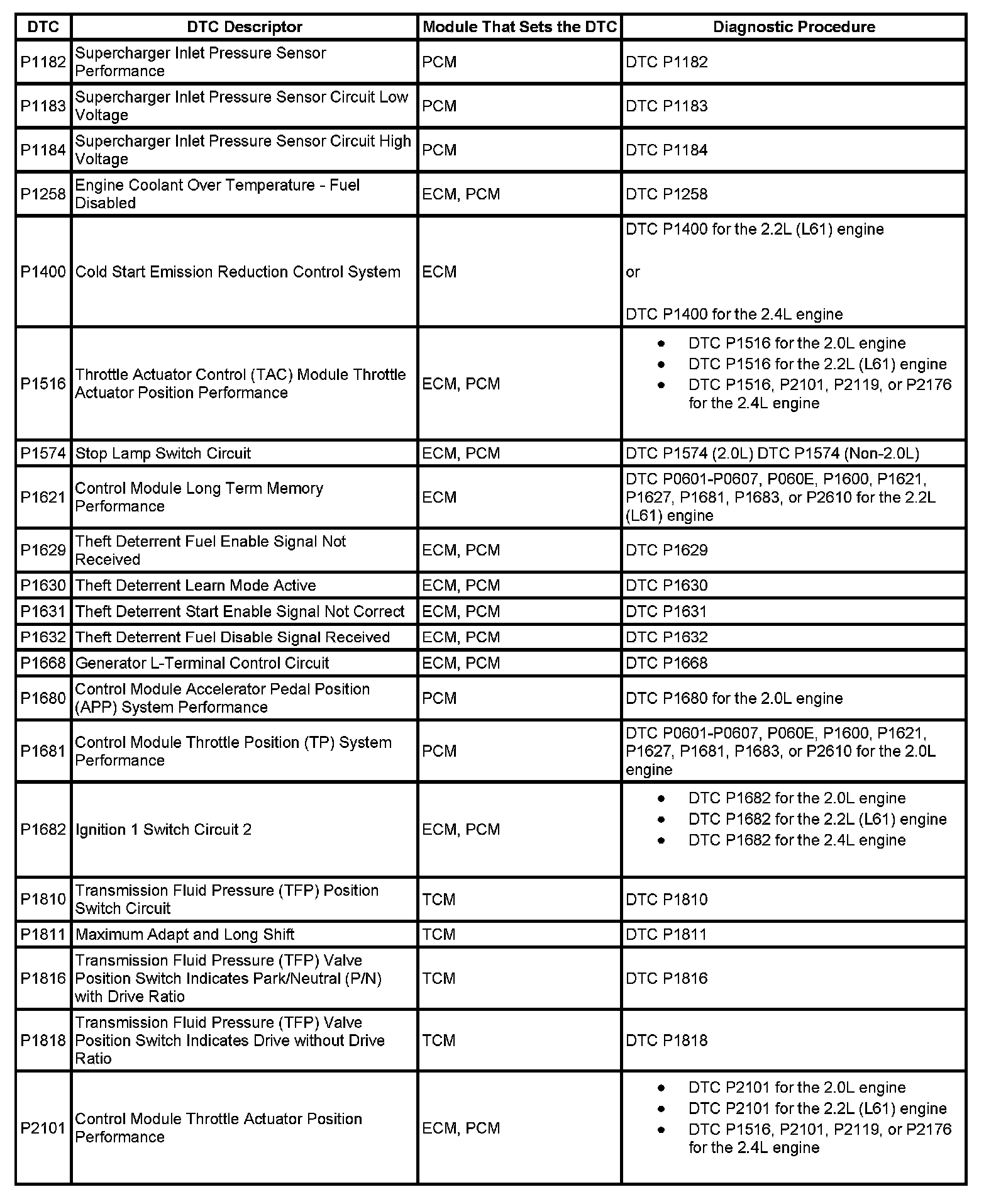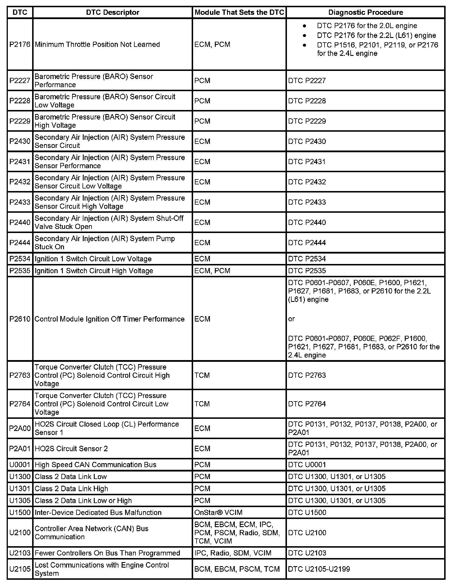 DTCs P2176 - U2105: