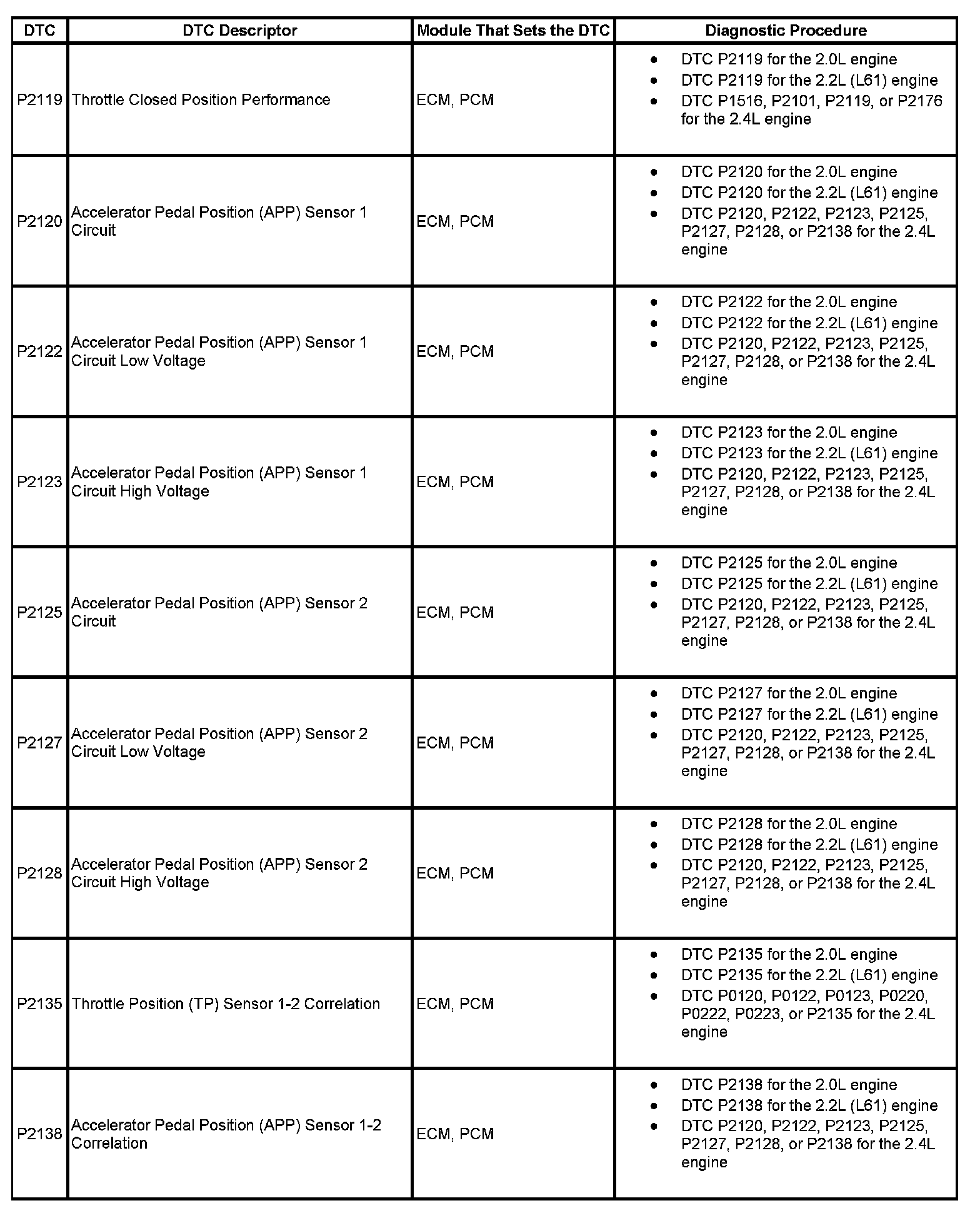 DTCs P2119 - P2138: