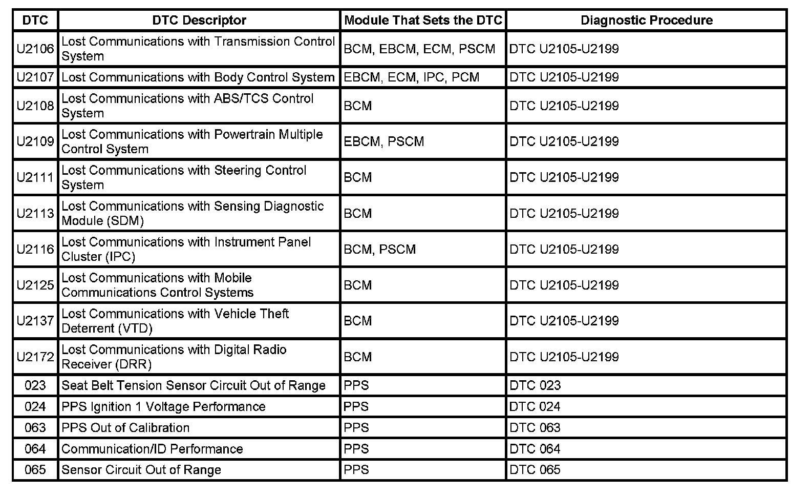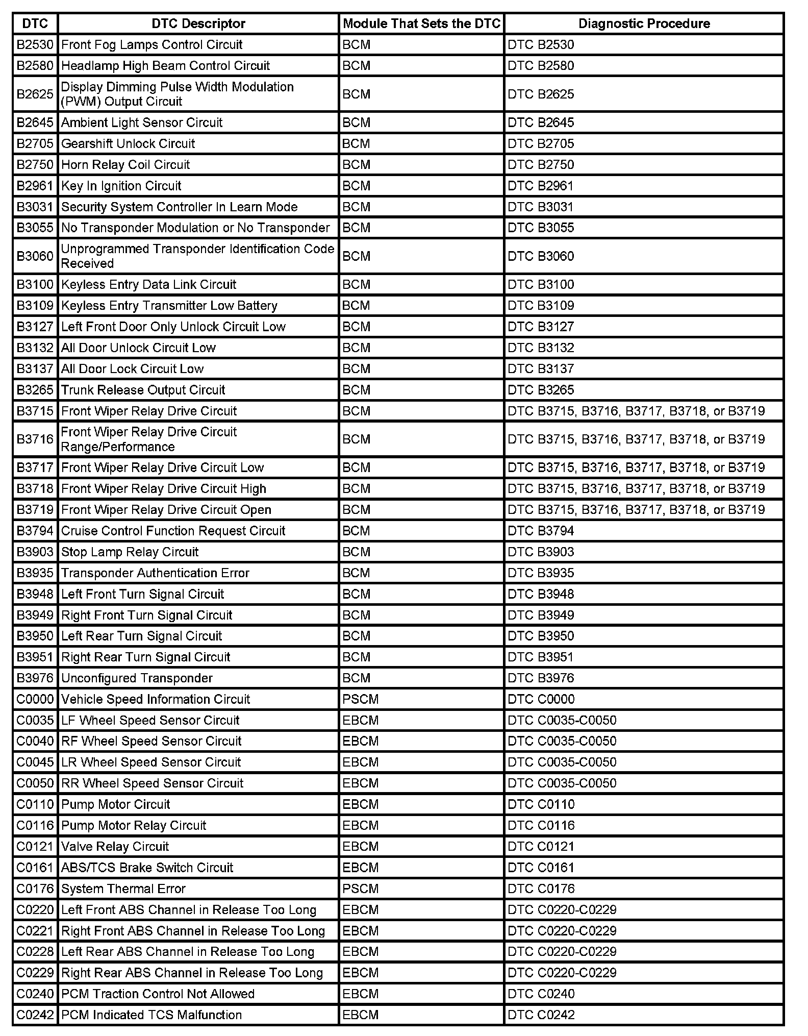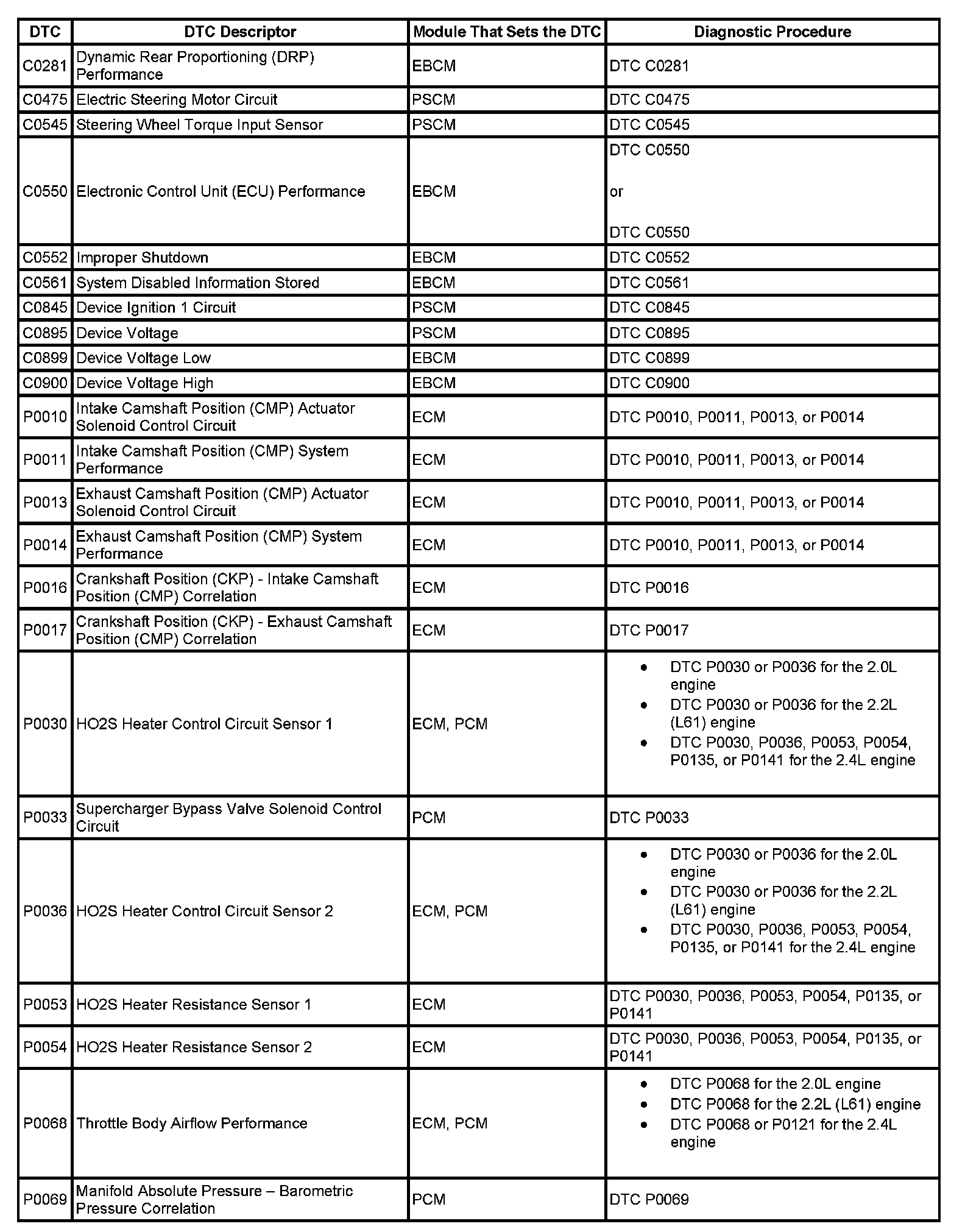 This master DTC list includes all applicable DTCs in alphanumeric order with descriptors.